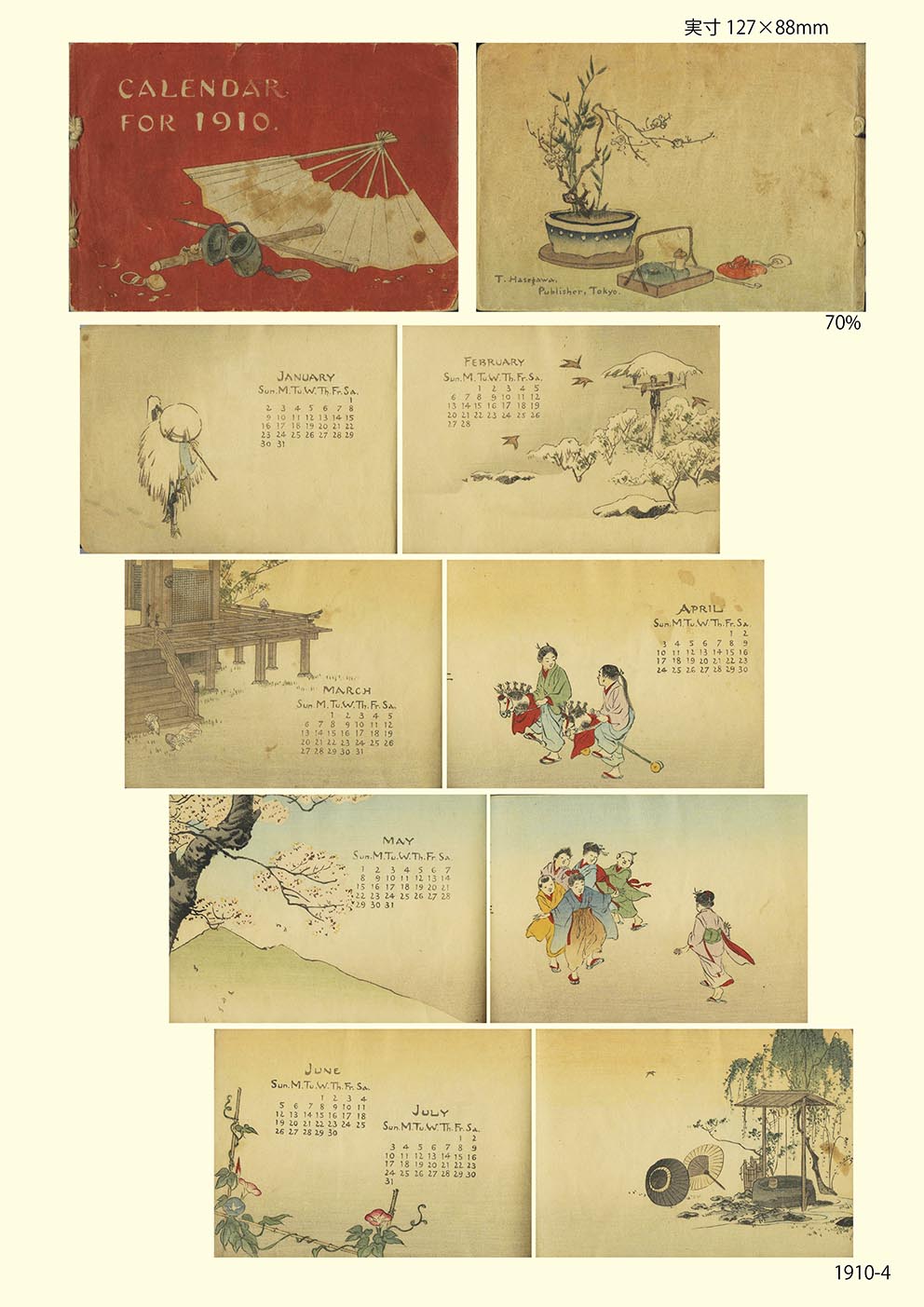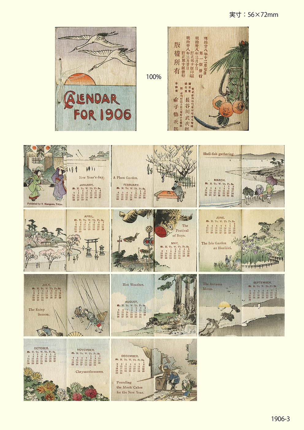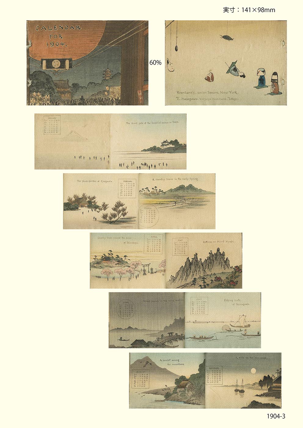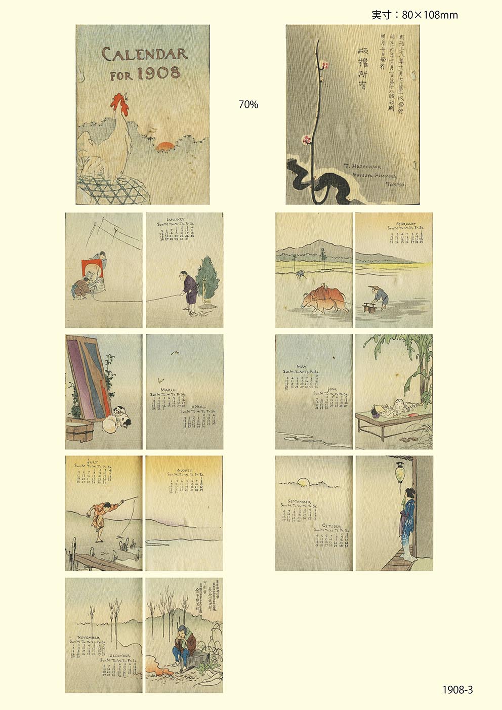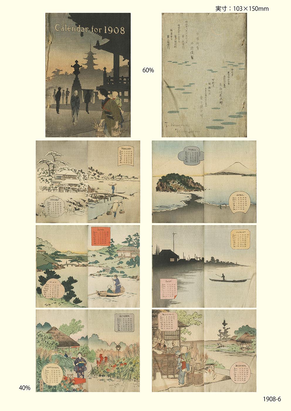 | 67 | 1908-2 | 明治41年 |  |  | Japanese Street Scenes Calendar for 1908 | | *Takejiro Hasegawa | | | | | | | | | | | 製本されておらずちりめん紙だがハードカバー、表紙なし