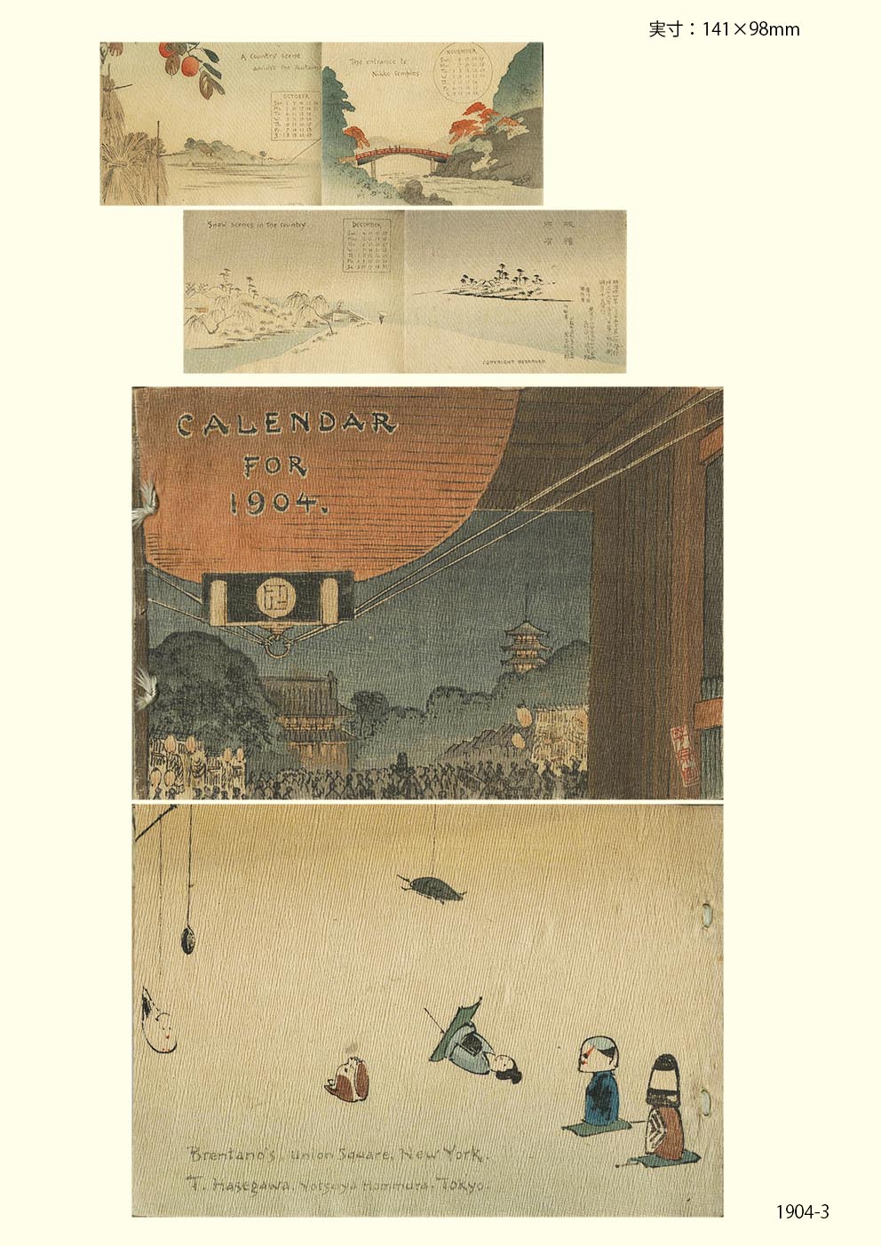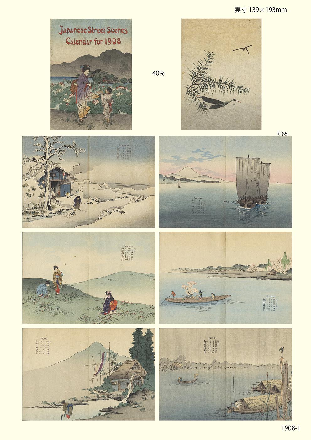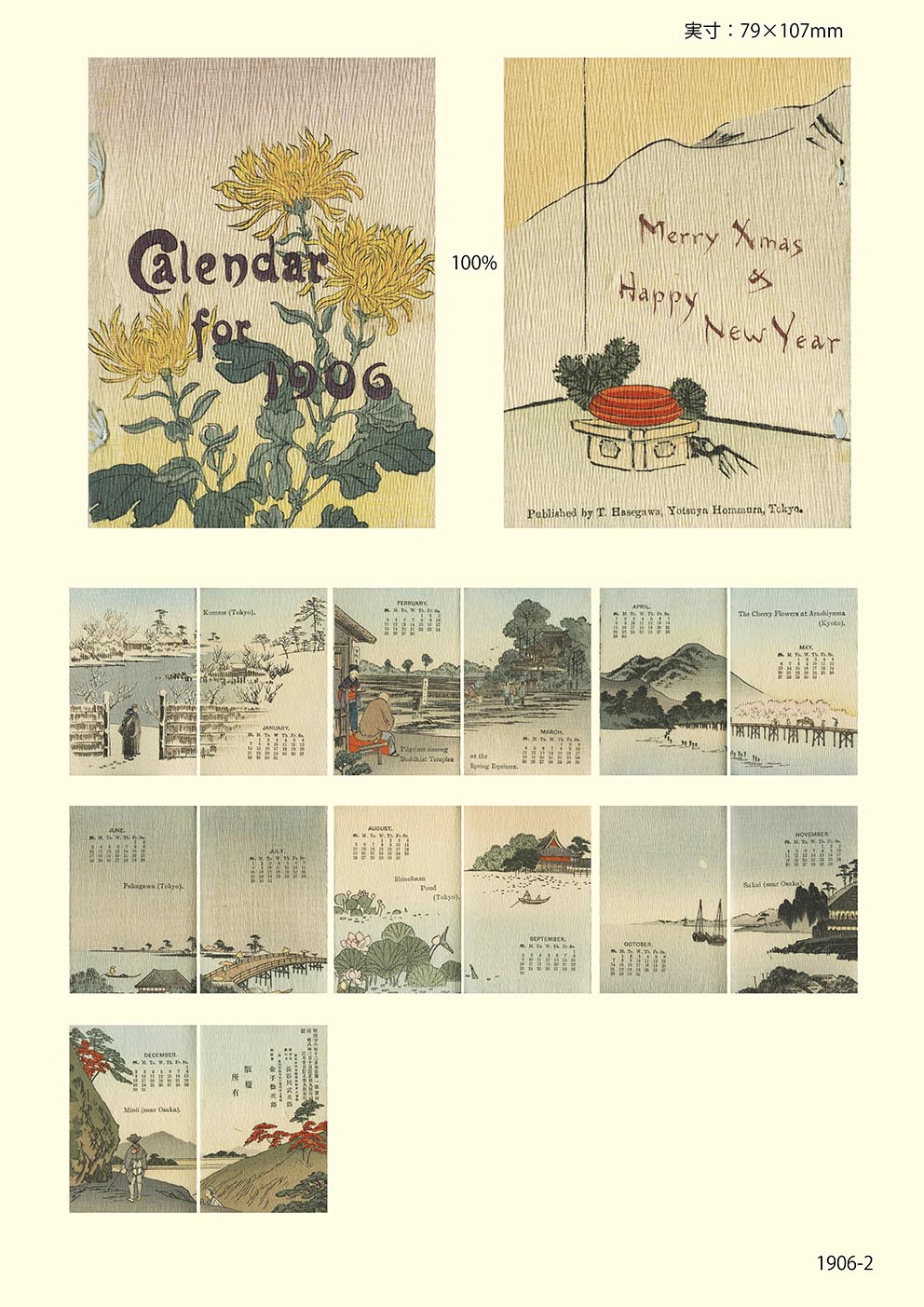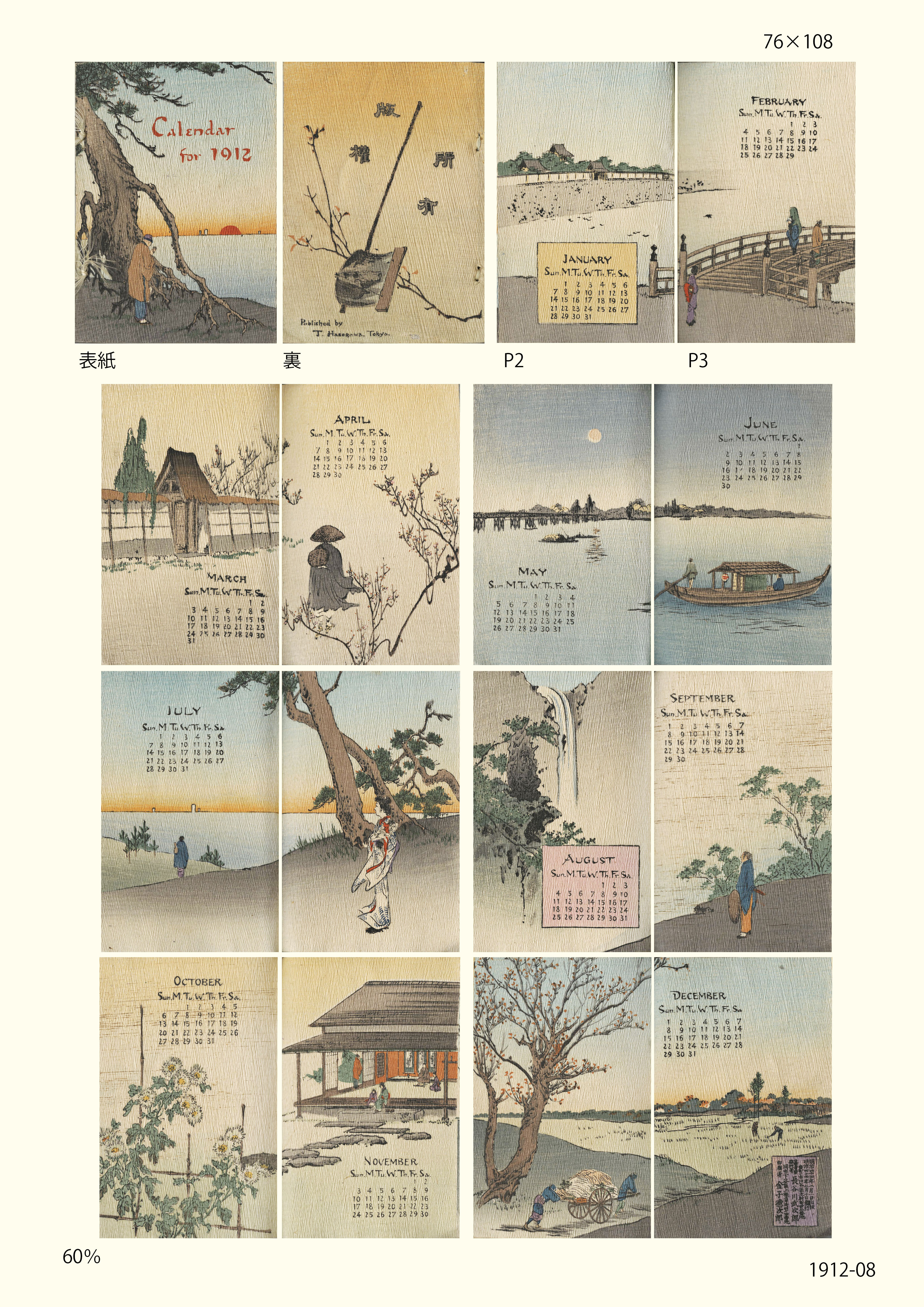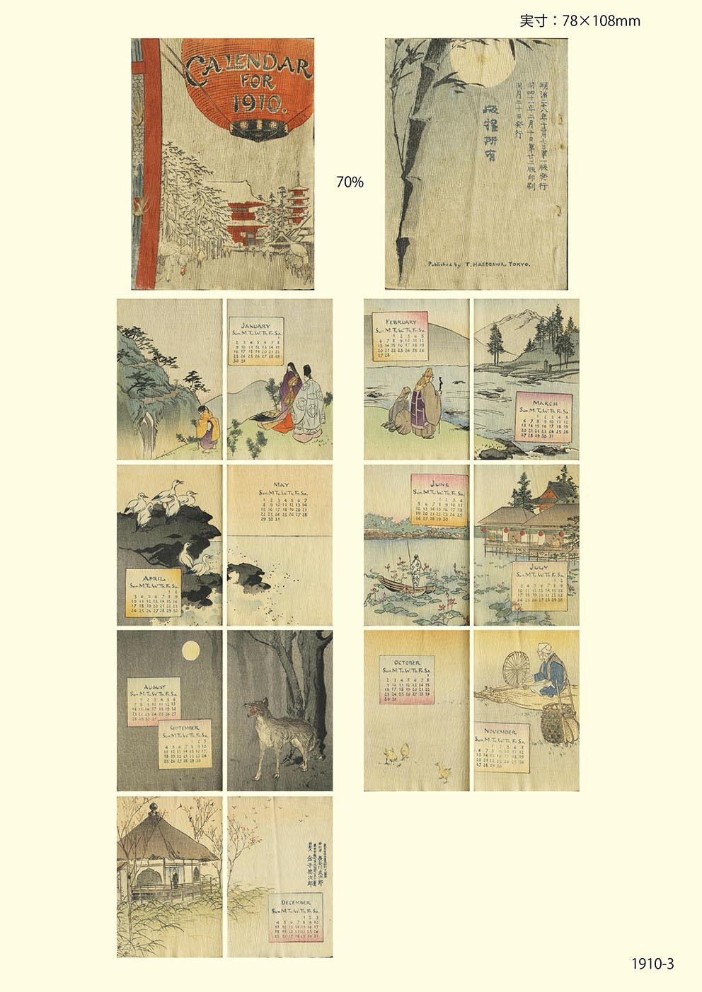 | 67 | 1908-2 | 明治41年 |  |  | Japanese Street Scenes Calendar for 1908 | | *Takejiro Hasegawa | | | | | | | | | | | 製本されておらずちりめん紙だがハードカバー、表紙なし