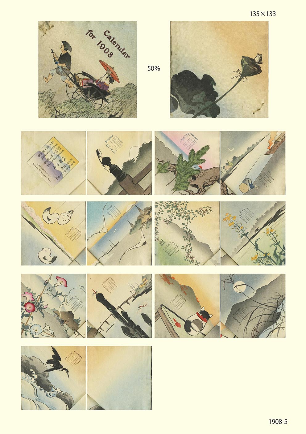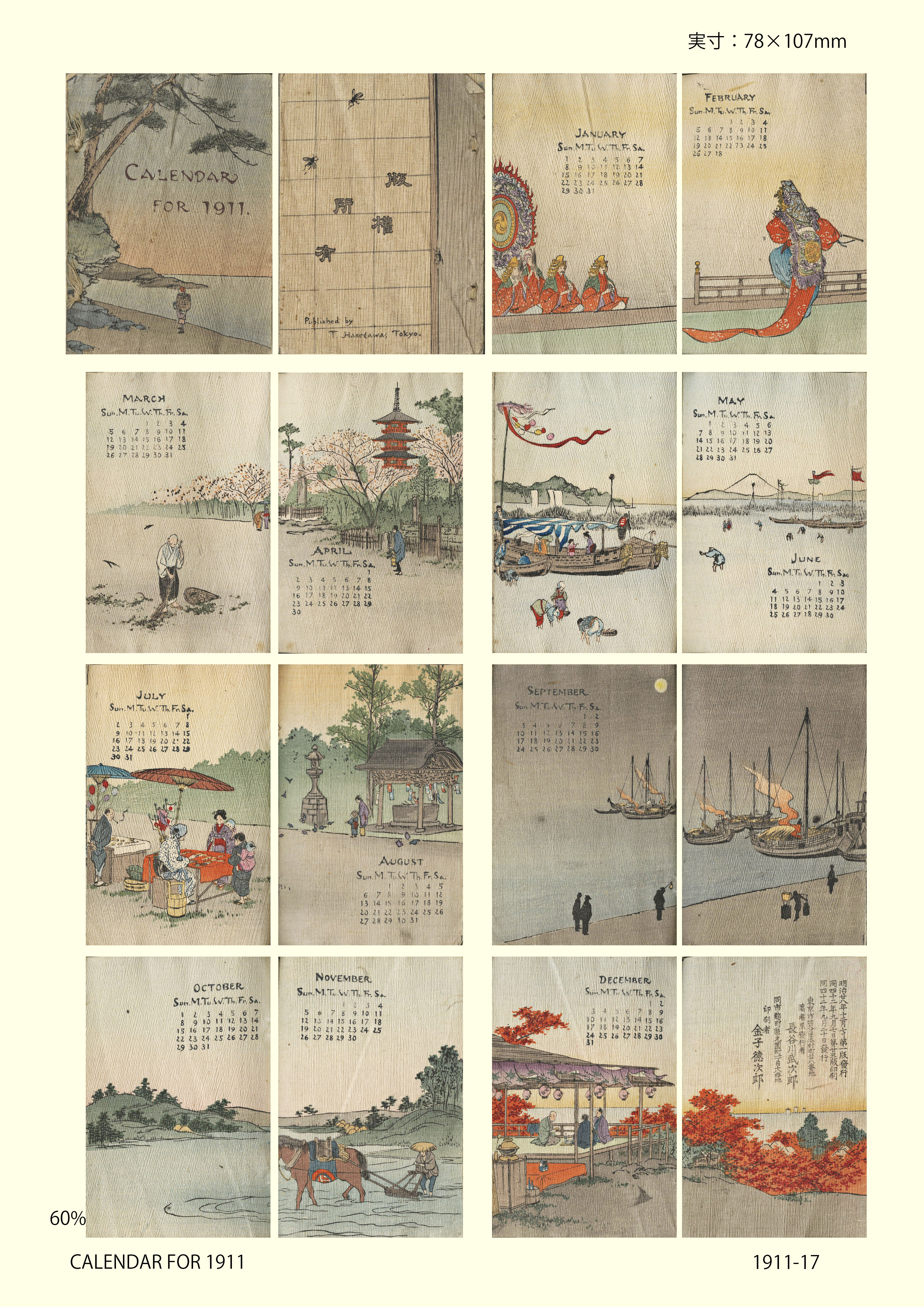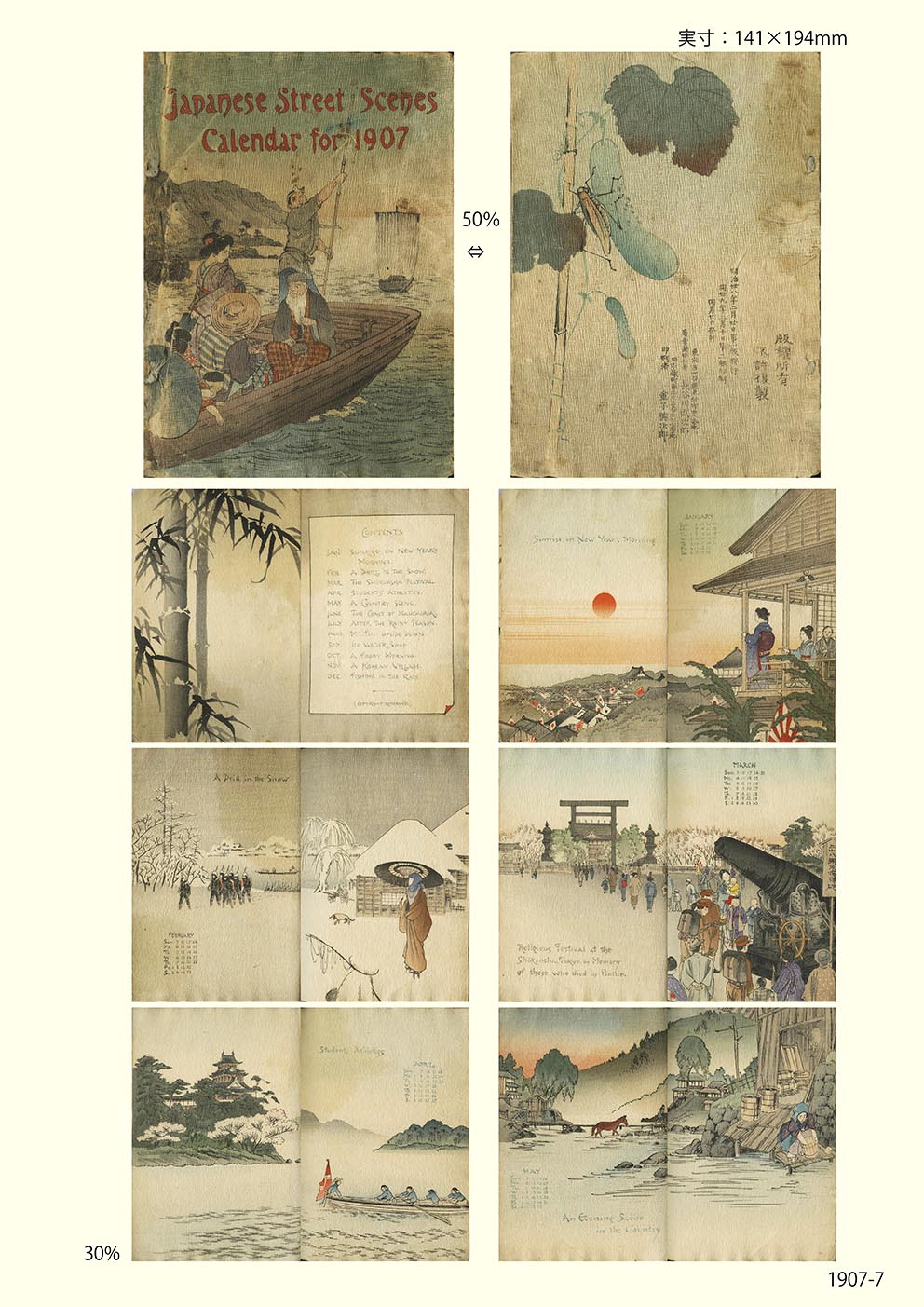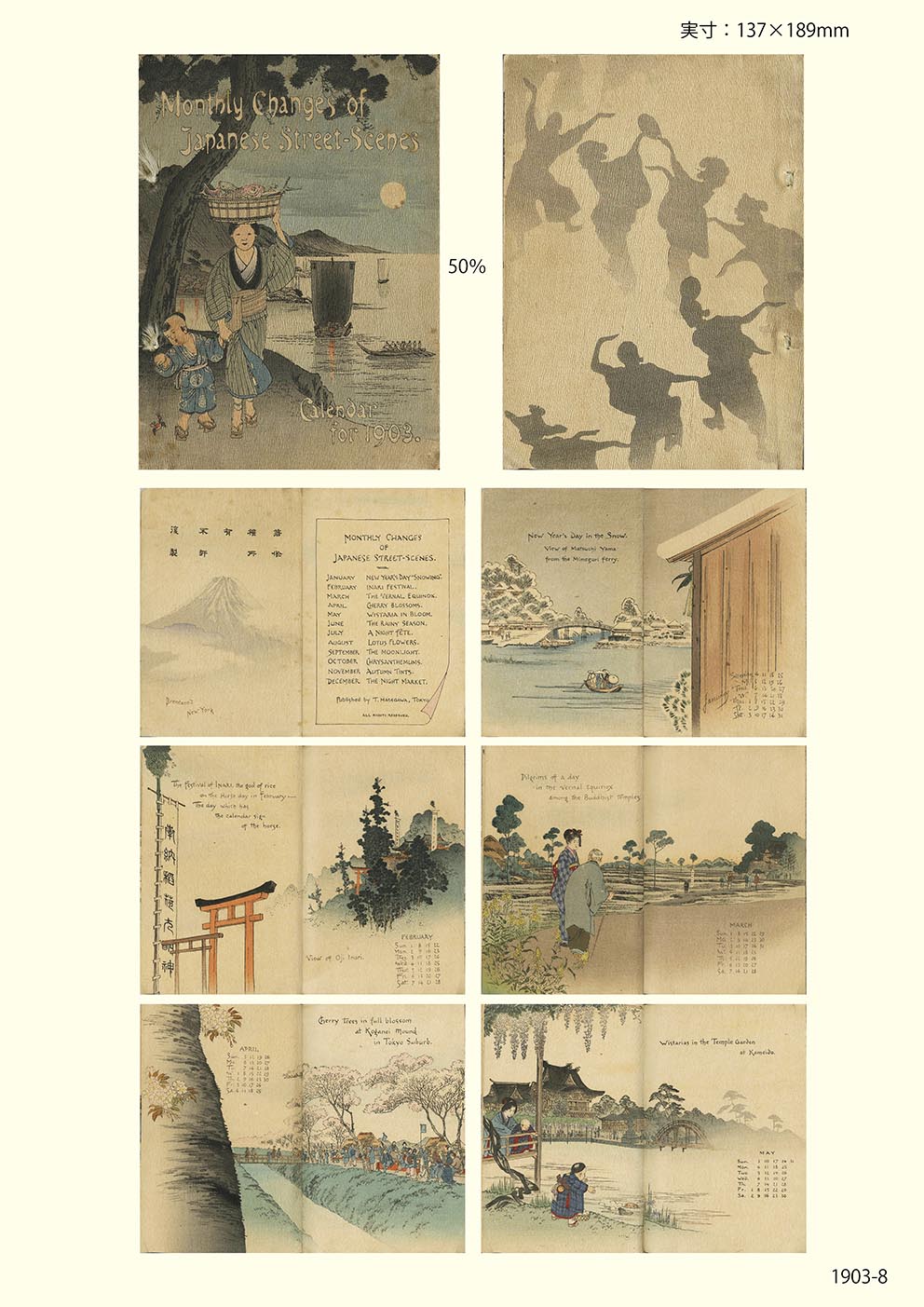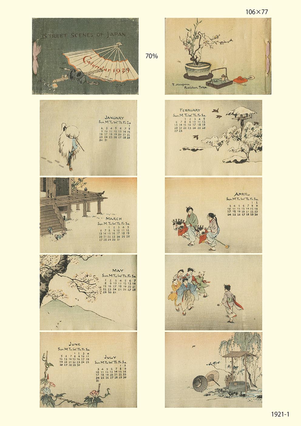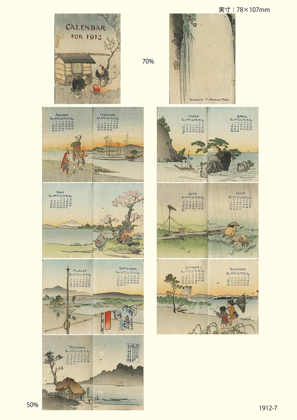 | 67 | 1908-2 | 明治41年 |  |  | Japanese Street Scenes Calendar for 1908 | | *Takejiro Hasegawa | | | | | | | | | | | 製本されておらずちりめん紙だがハードカバー、表紙なし
