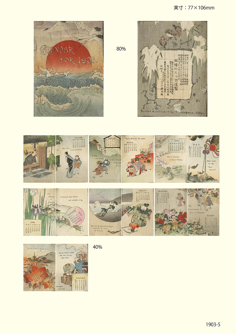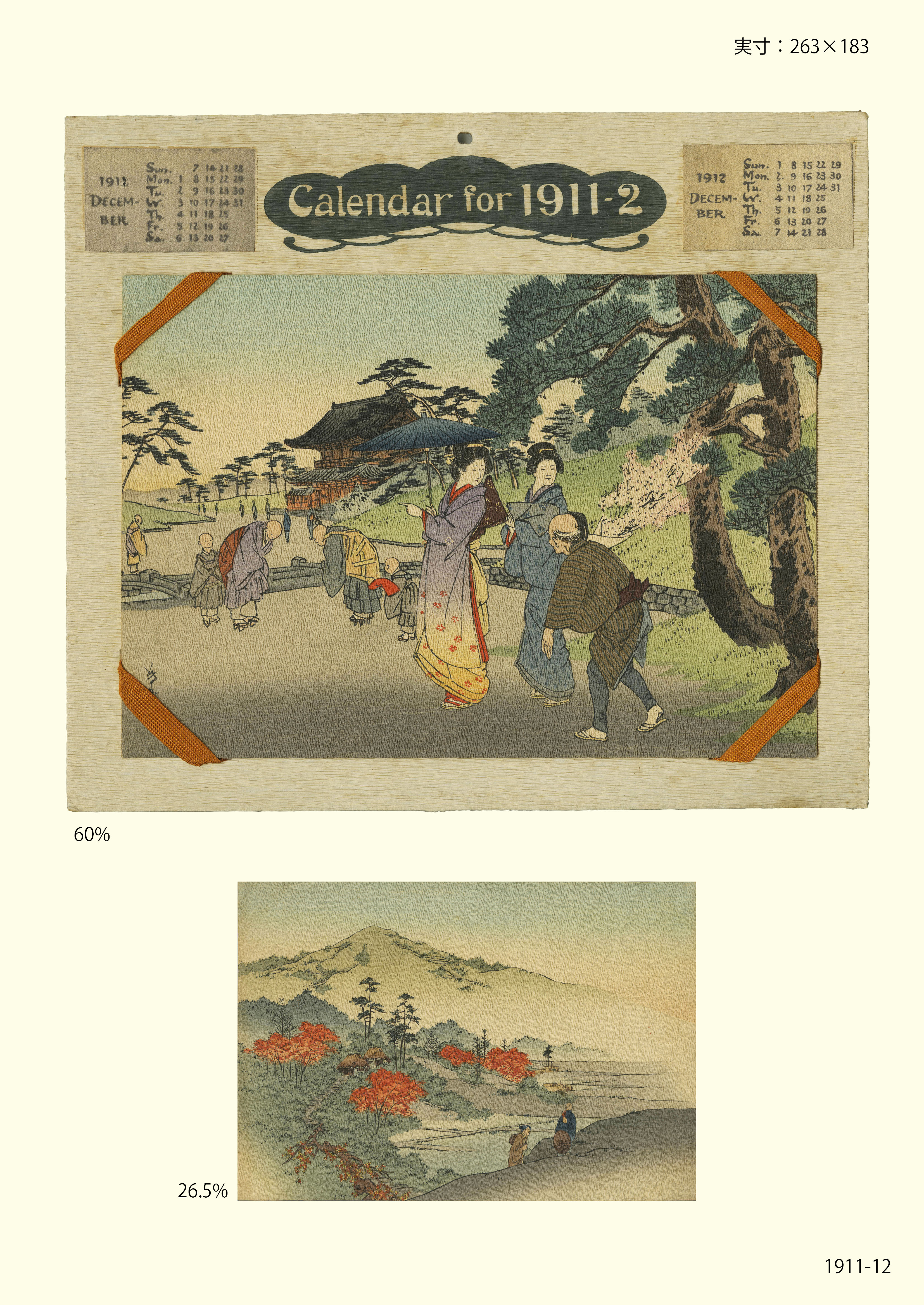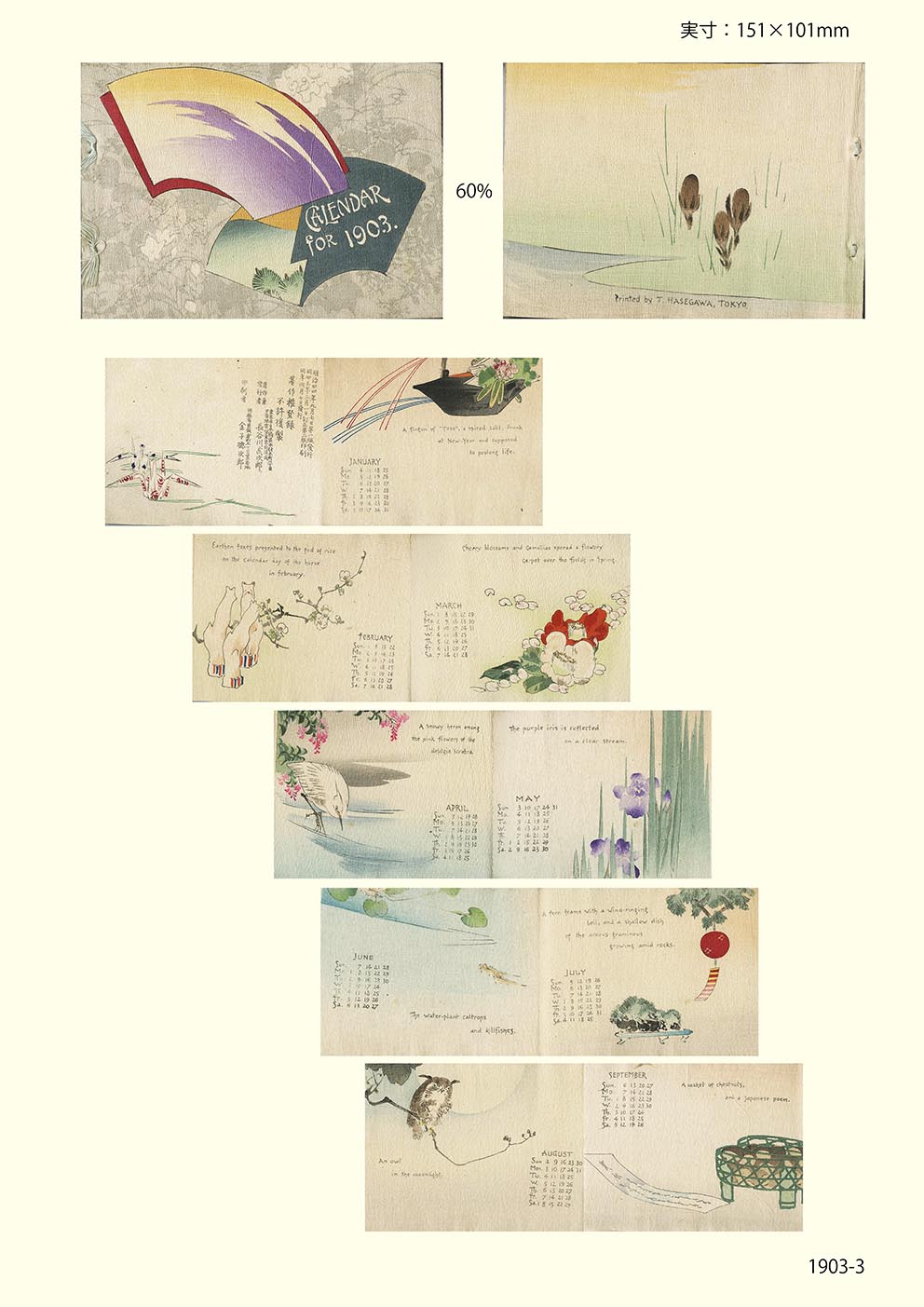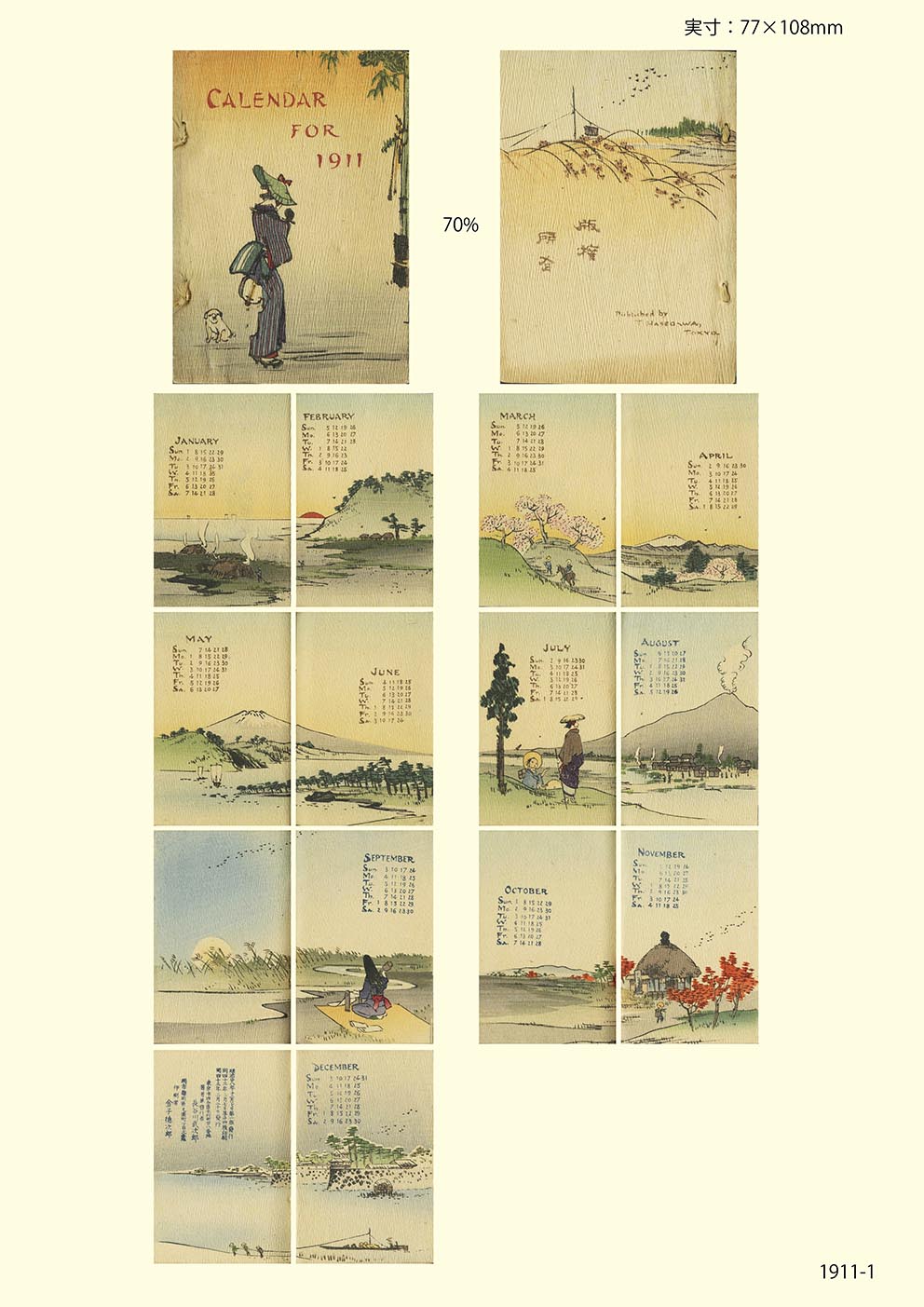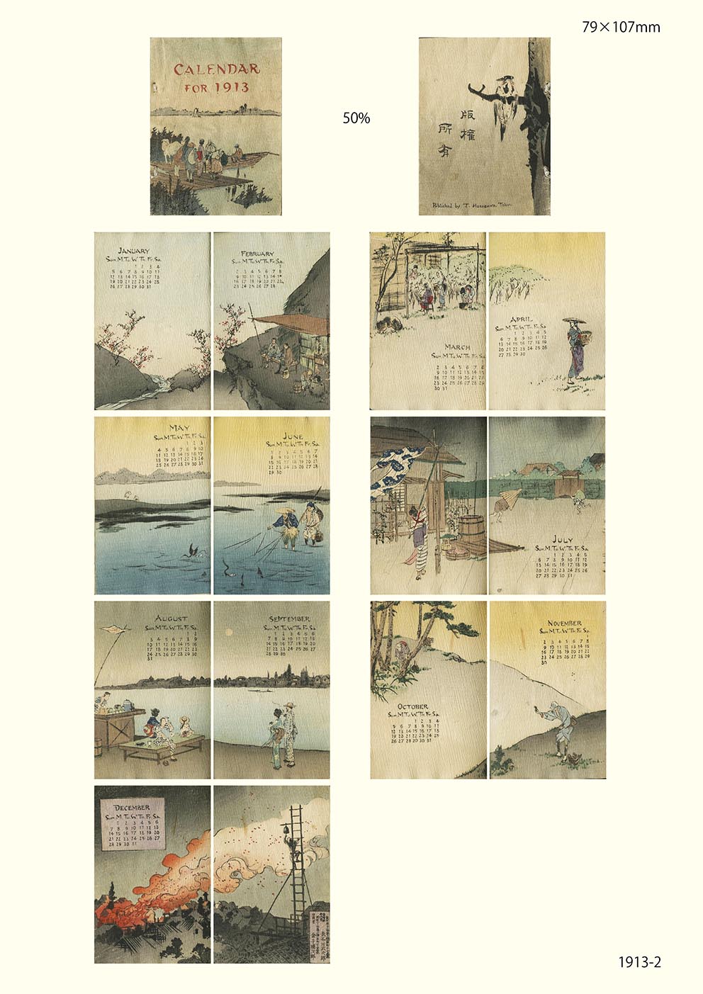| 67 | 1908-2 | 明治41年 |  |  | Japanese Street Scenes Calendar for 1908 | | *Takejiro Hasegawa | | | | | | | | | | | 製本されておらずちりめん紙だがハードカバー、表紙なし