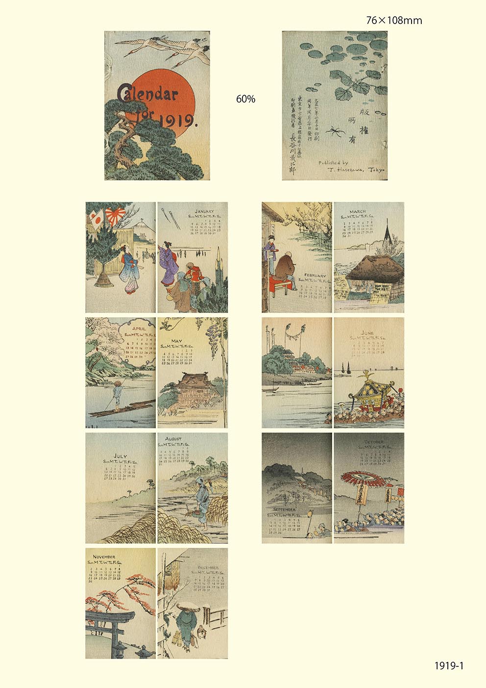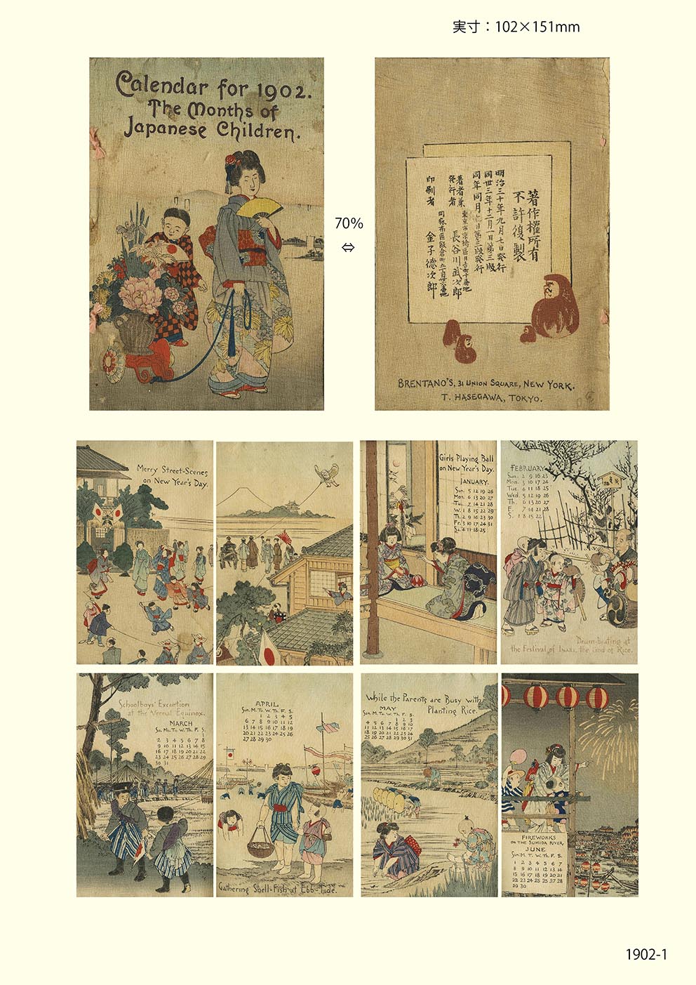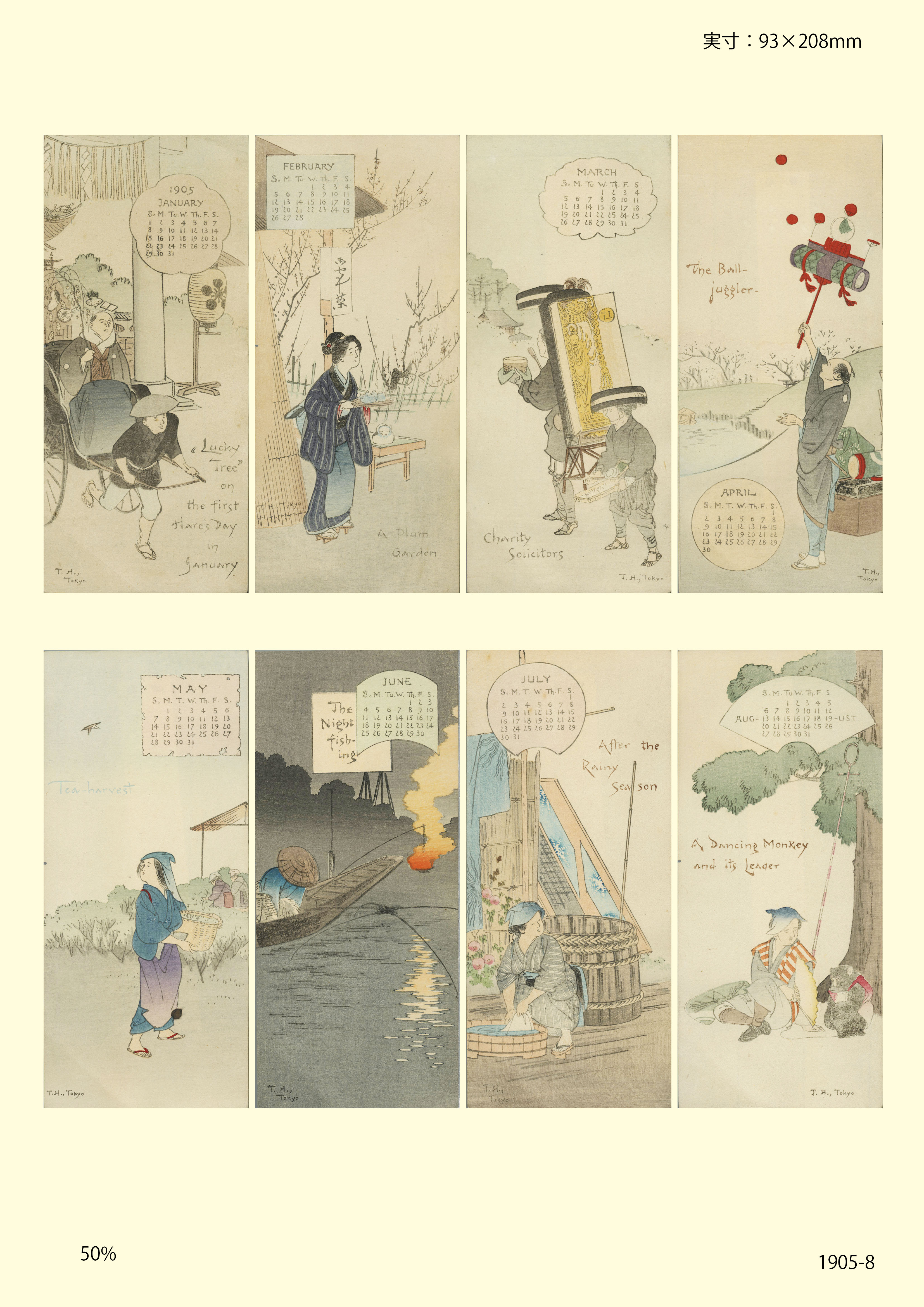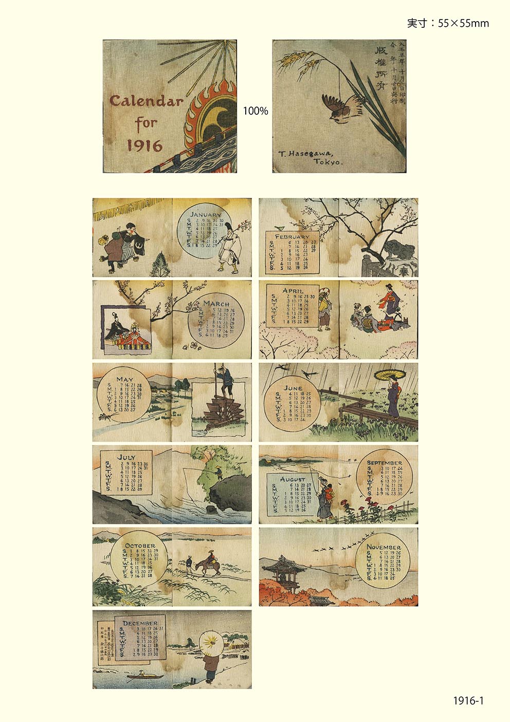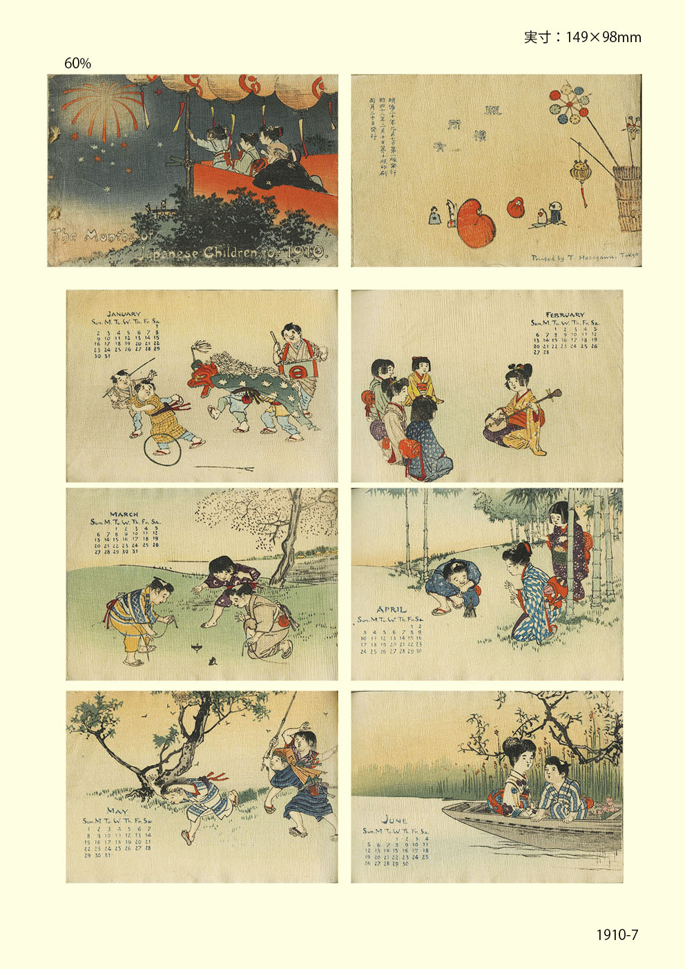 | 67 | 1908-2 | 明治41年 |  |  | Japanese Street Scenes Calendar for 1908 | | *Takejiro Hasegawa | | | | | | | | | | | 製本されておらずちりめん紙だがハードカバー、表紙なし