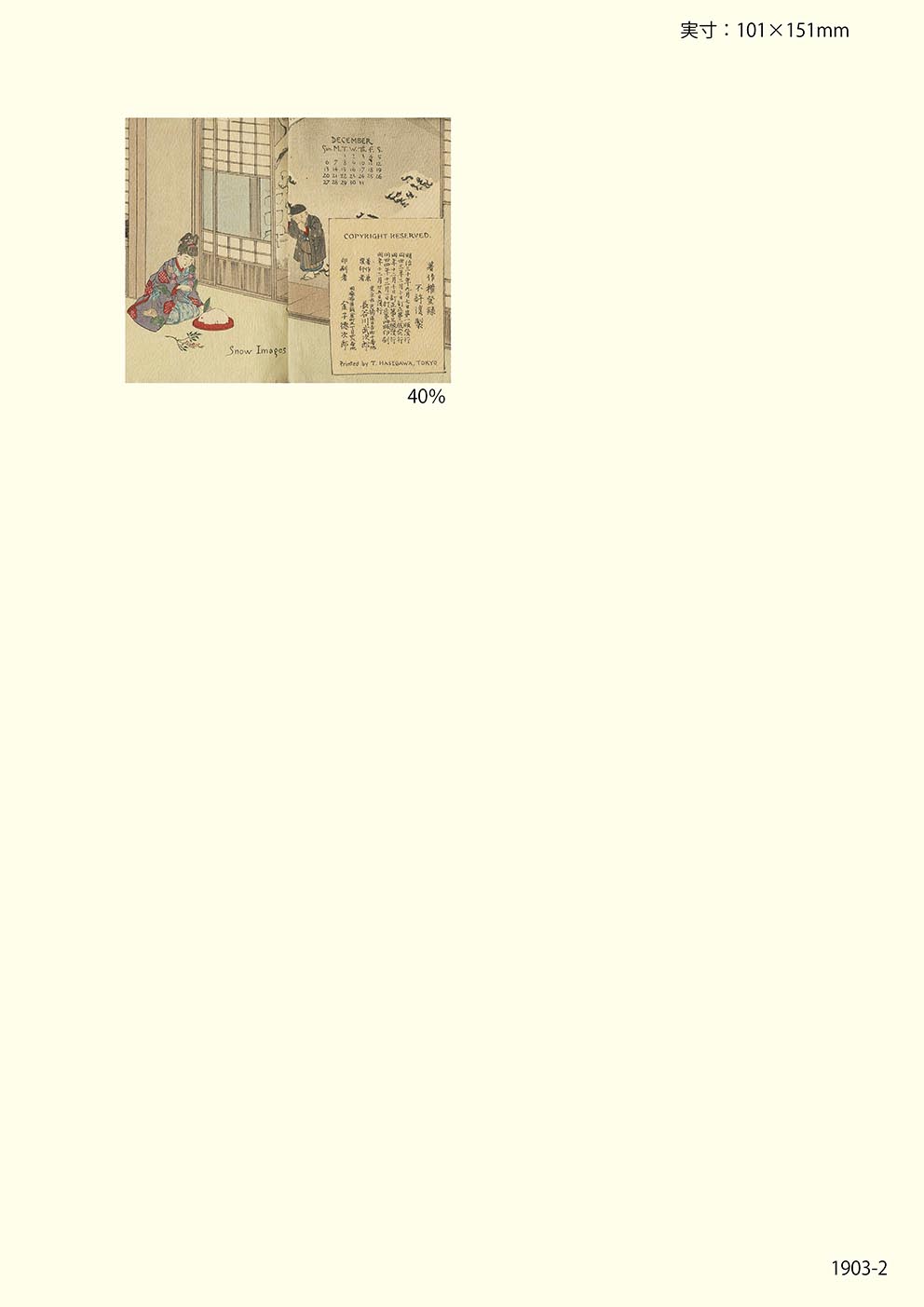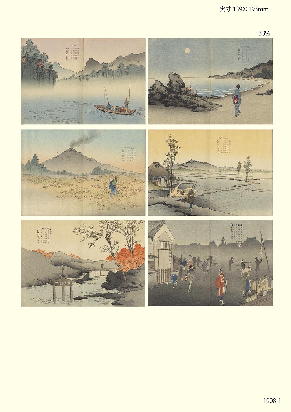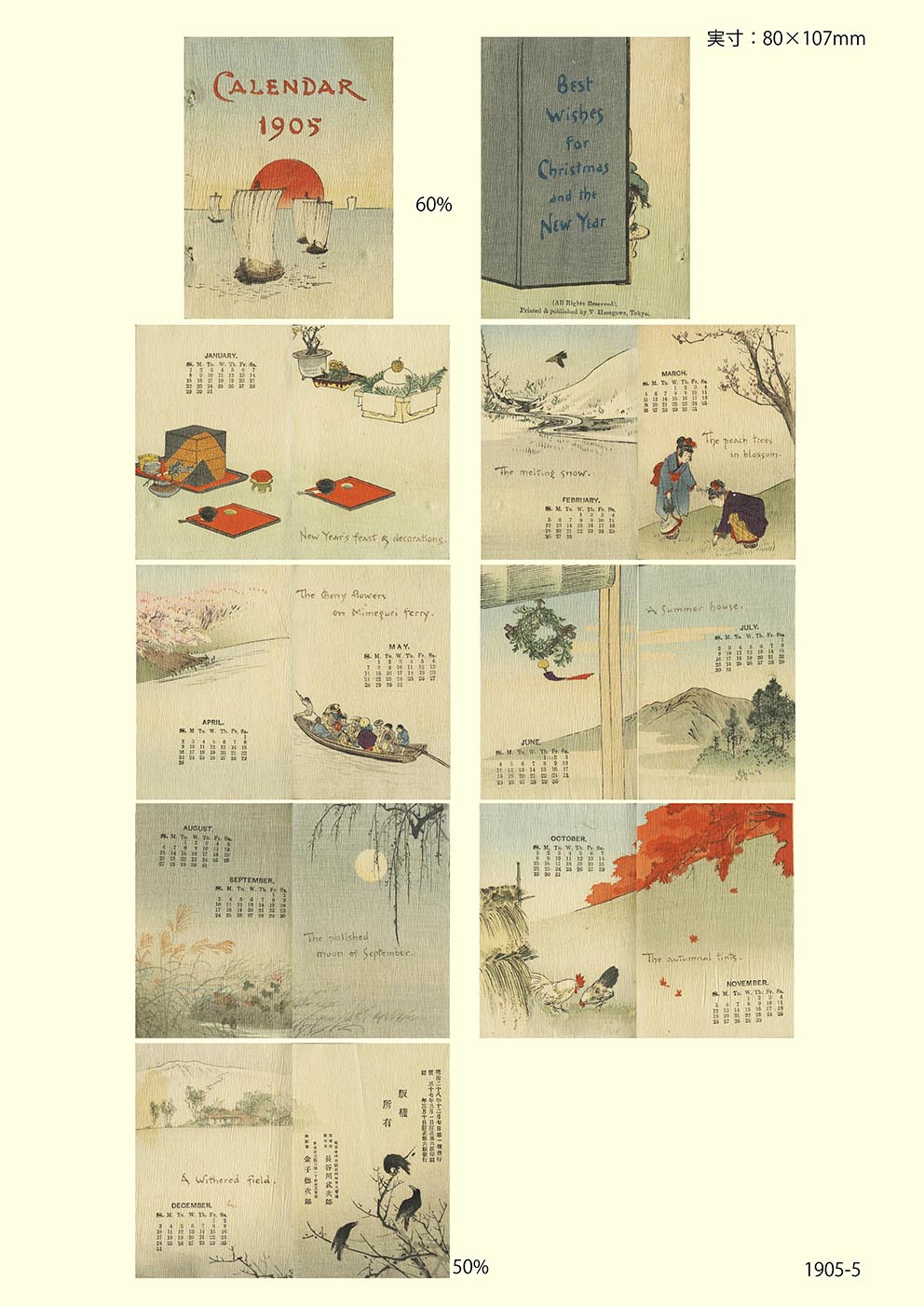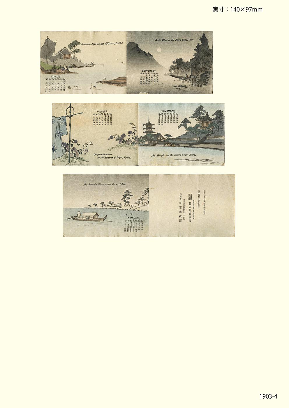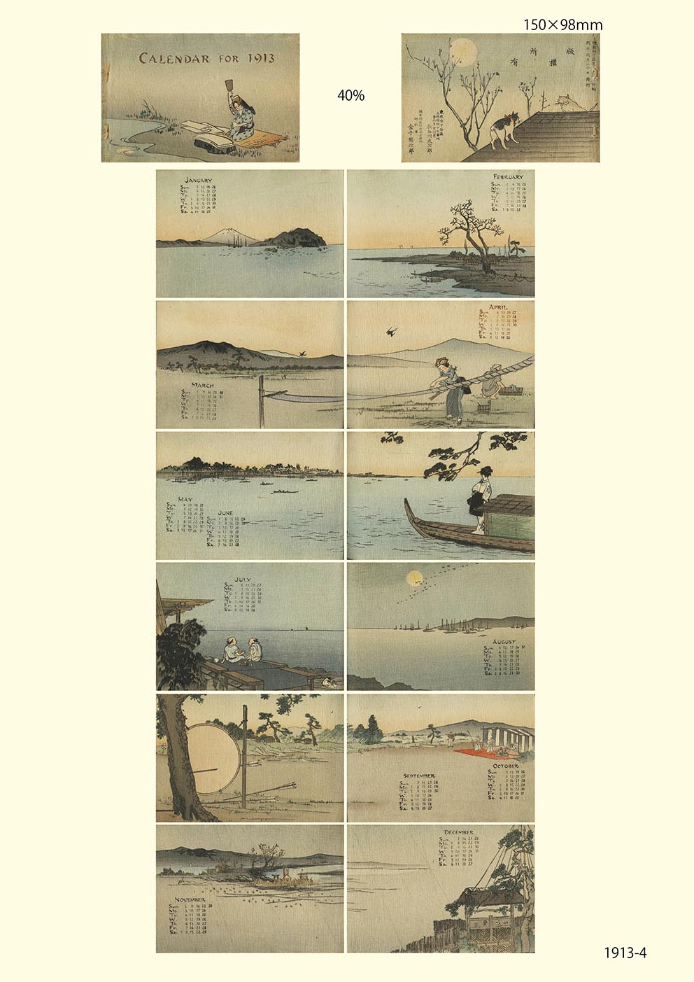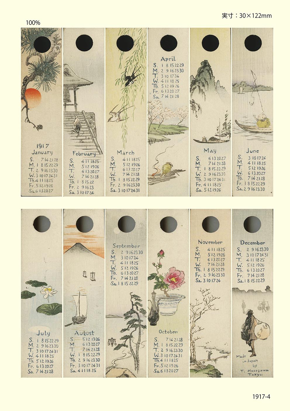 | 67 | 1908-2 | 明治41年 |  |  | Japanese Street Scenes Calendar for 1908 | | *Takejiro Hasegawa | | | | | | | | | | | 製本されておらずちりめん紙だがハードカバー、表紙なし