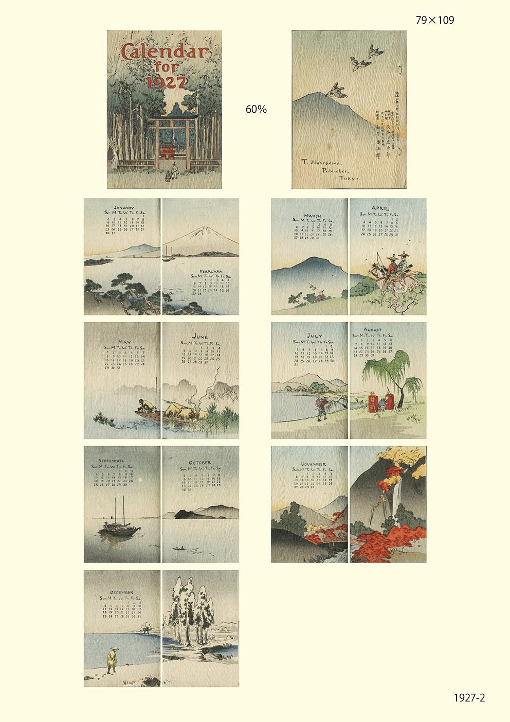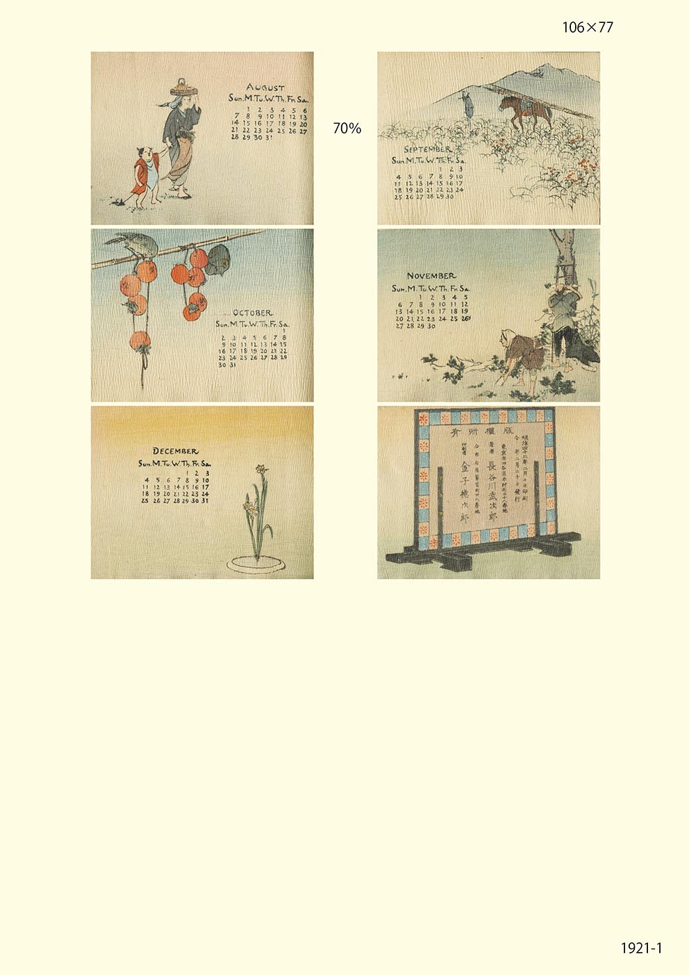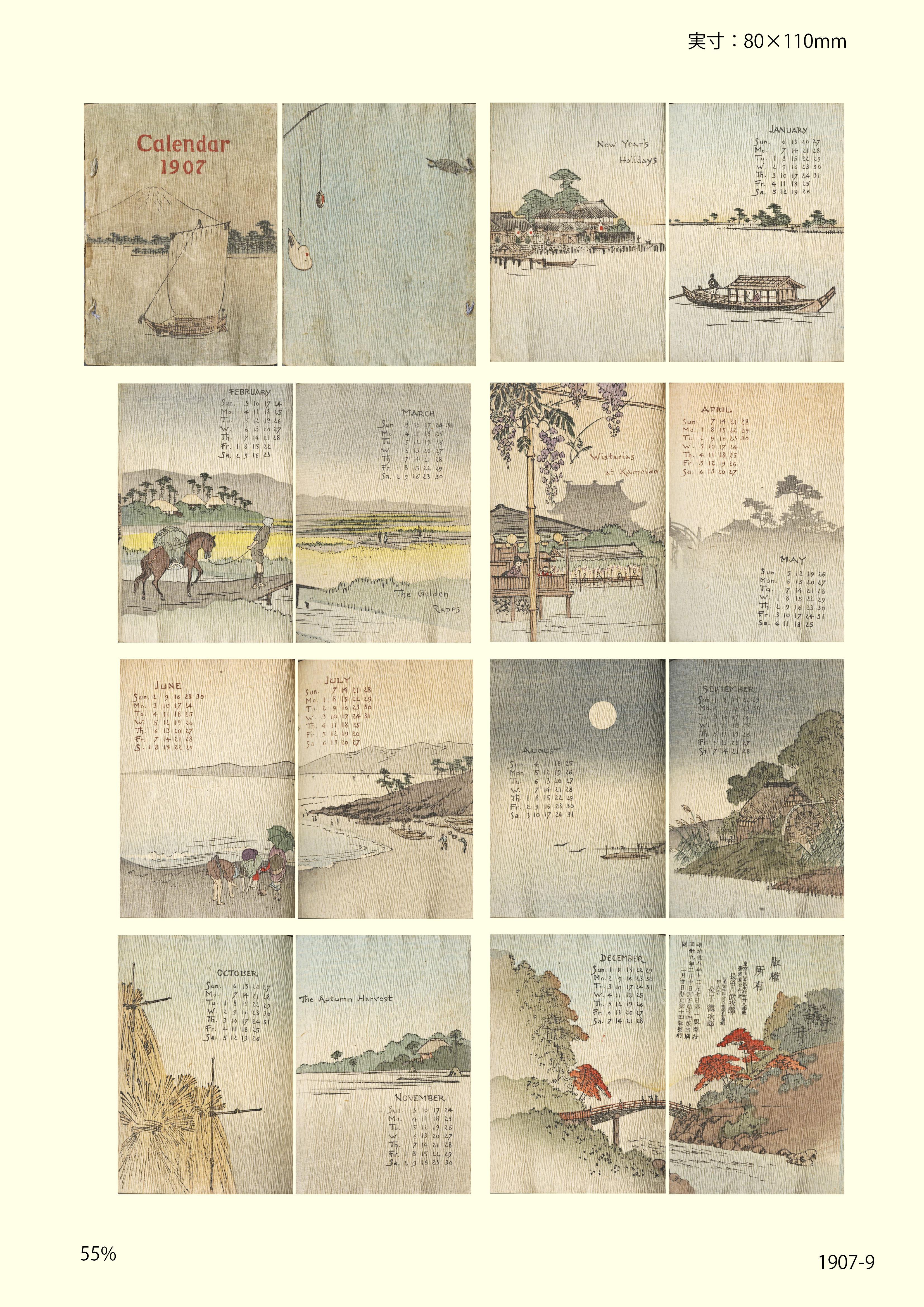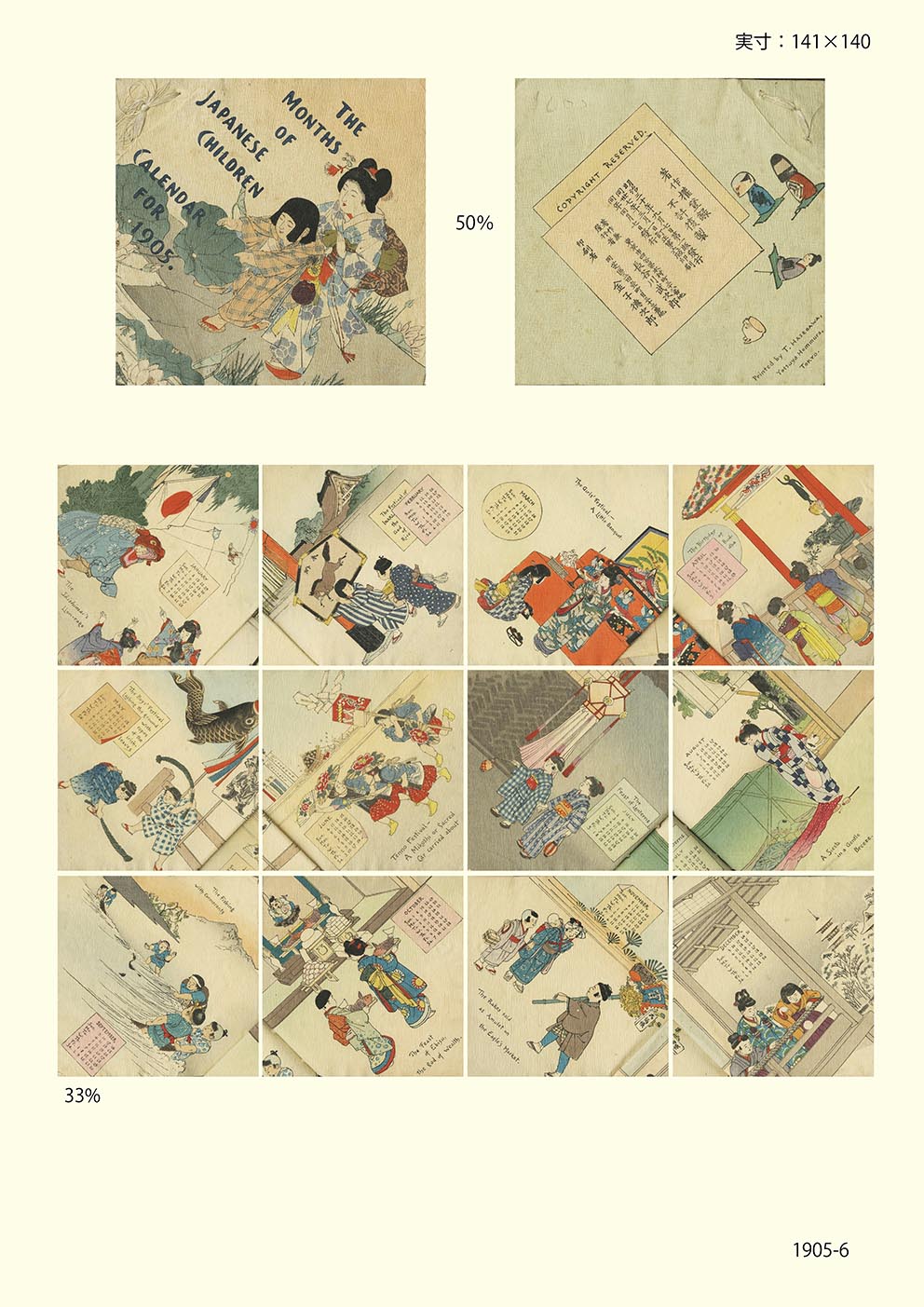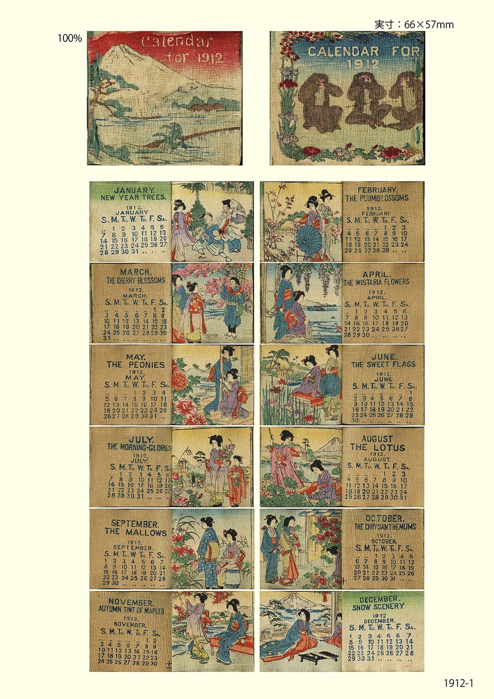 | 67 | 1908-2 | 明治41年 |  |  | Japanese Street Scenes Calendar for 1908 | | *Takejiro Hasegawa | | | | | | | | | | | 製本されておらずちりめん紙だがハードカバー、表紙なし