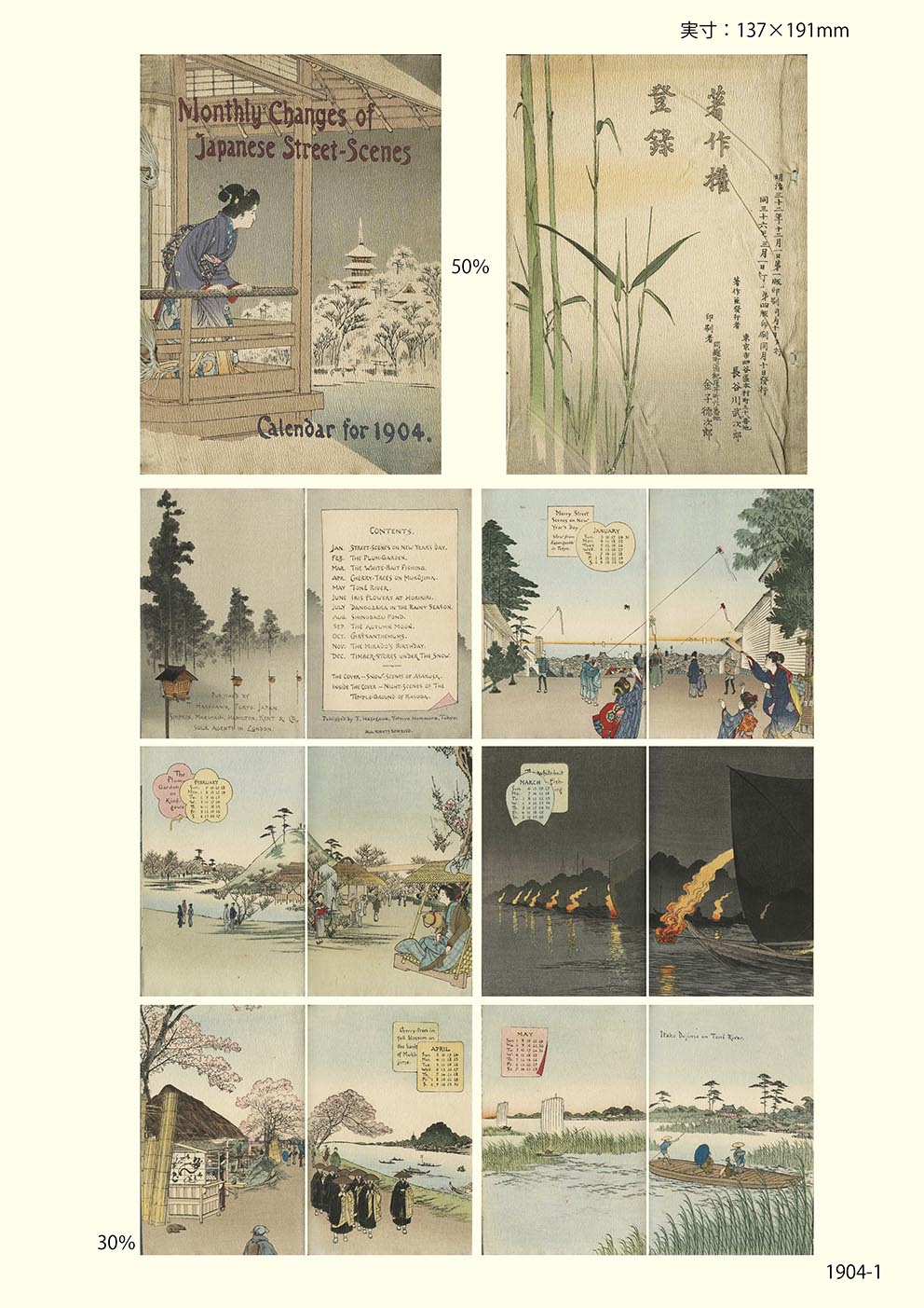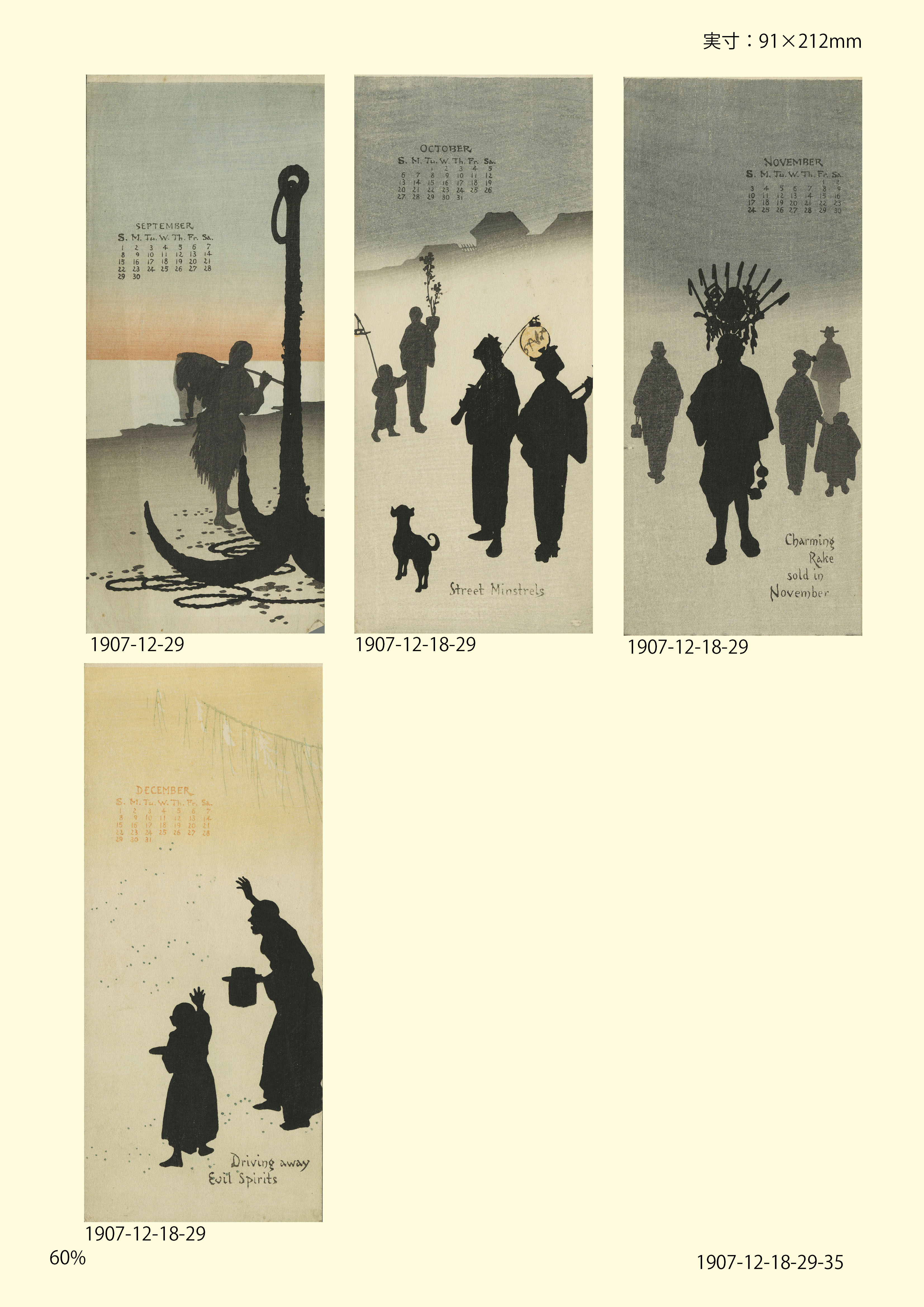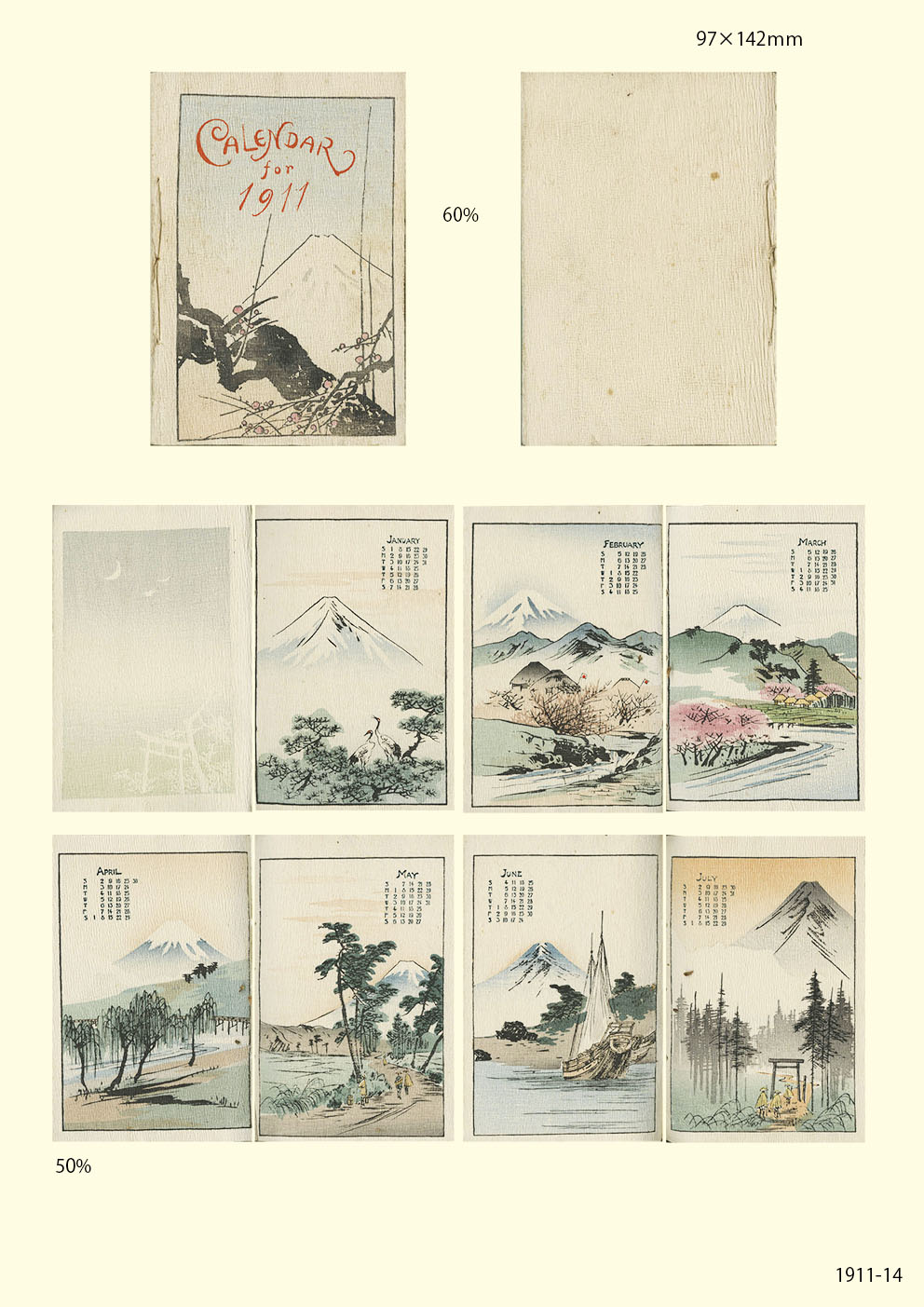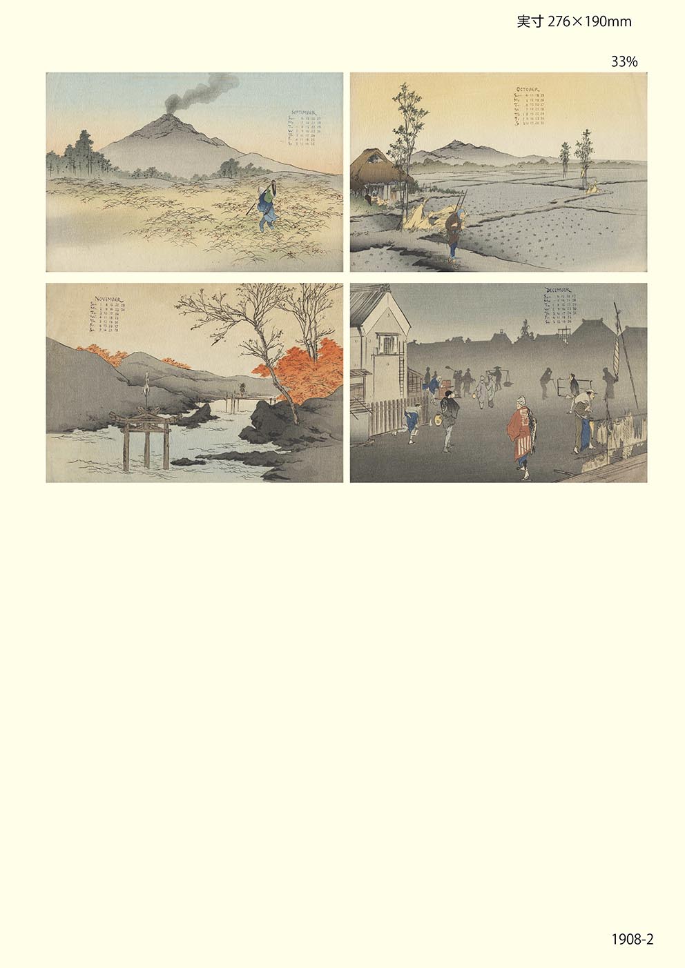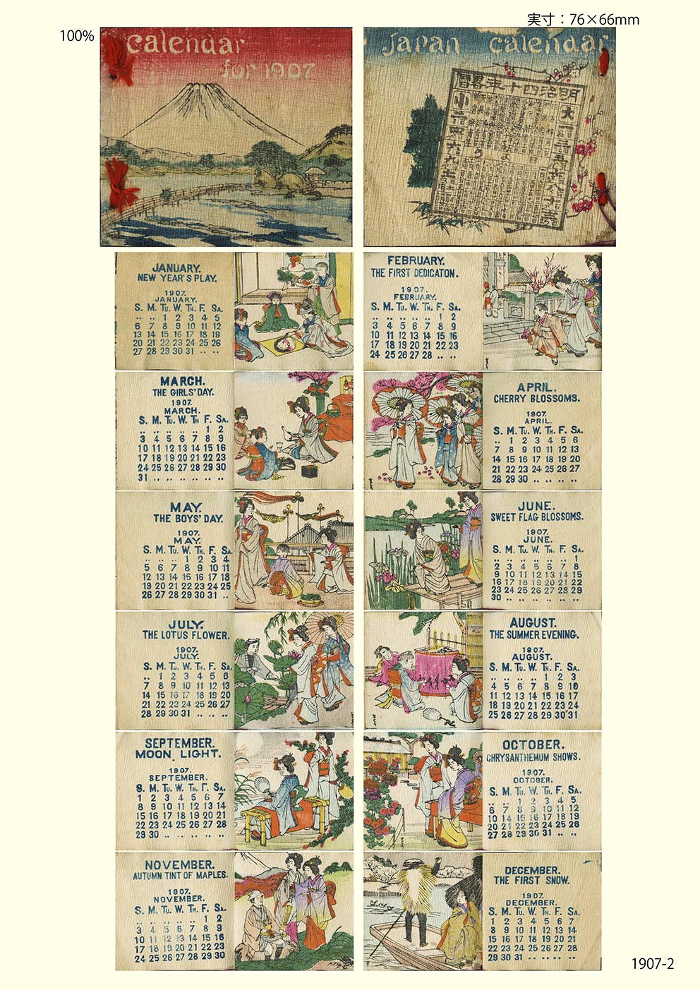 | 67 | 1908-2 | 明治41年 |  |  | Japanese Street Scenes Calendar for 1908 | | *Takejiro Hasegawa | | | | | | | | | | | 製本されておらずちりめん紙だがハードカバー、表紙なし
