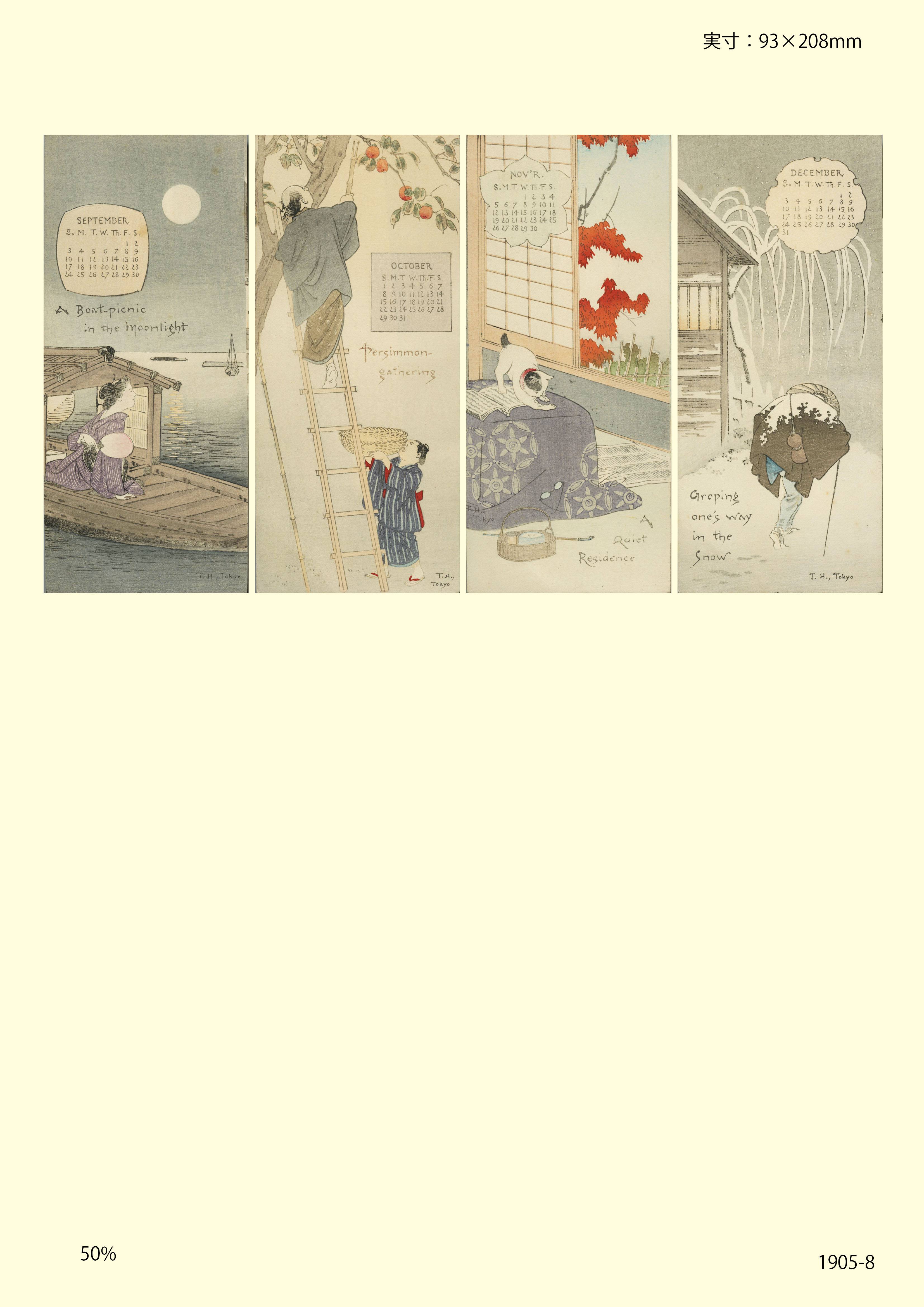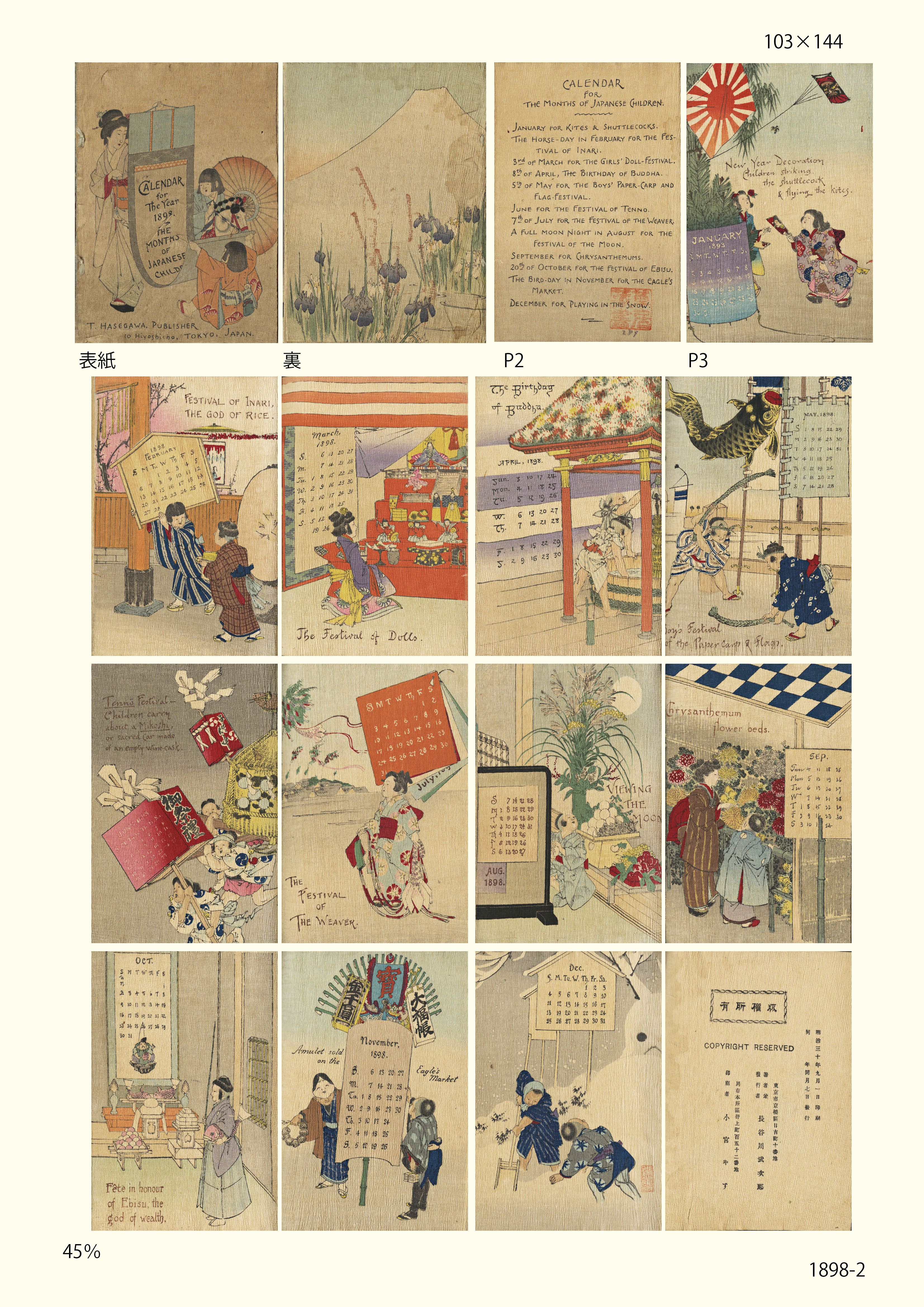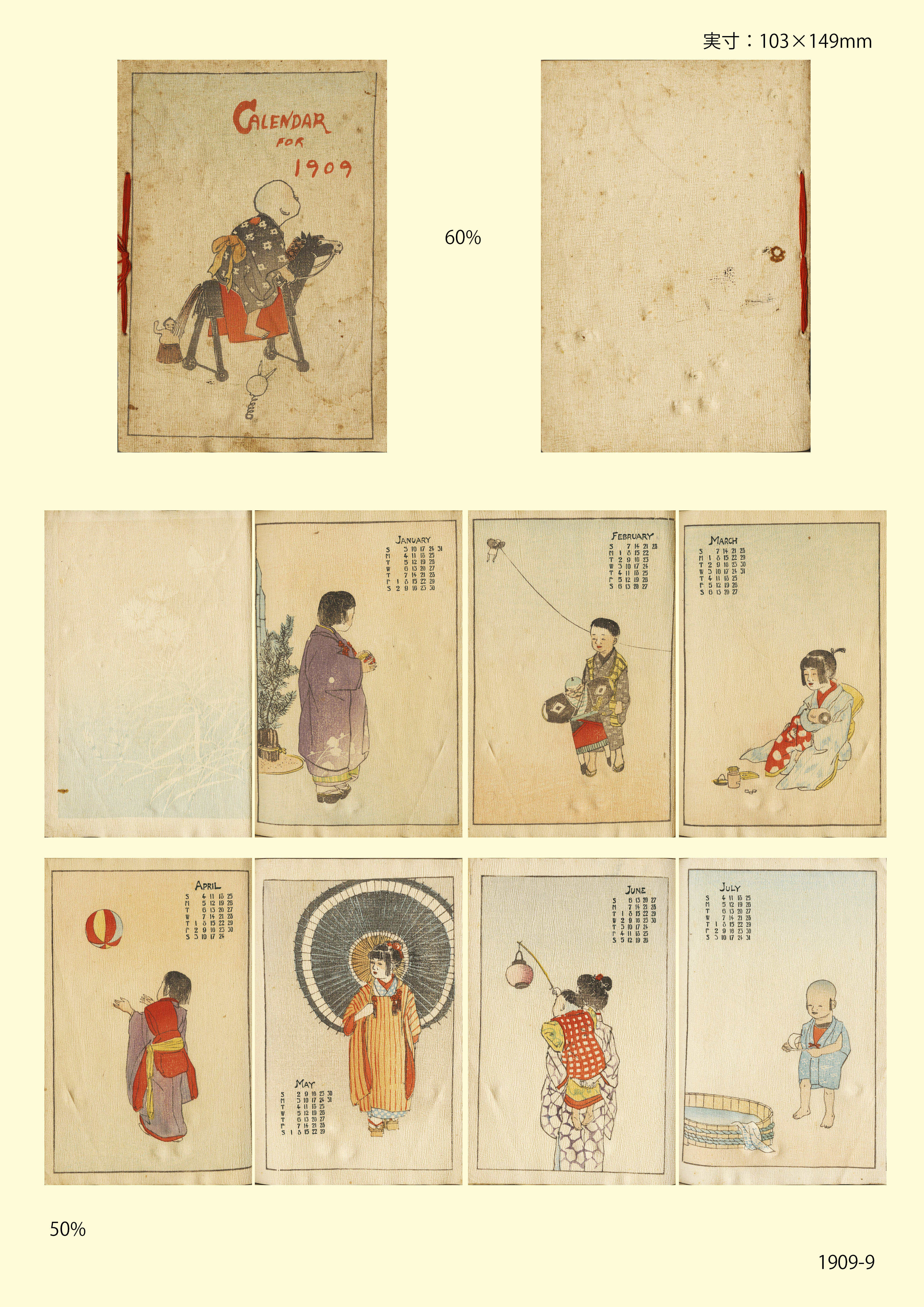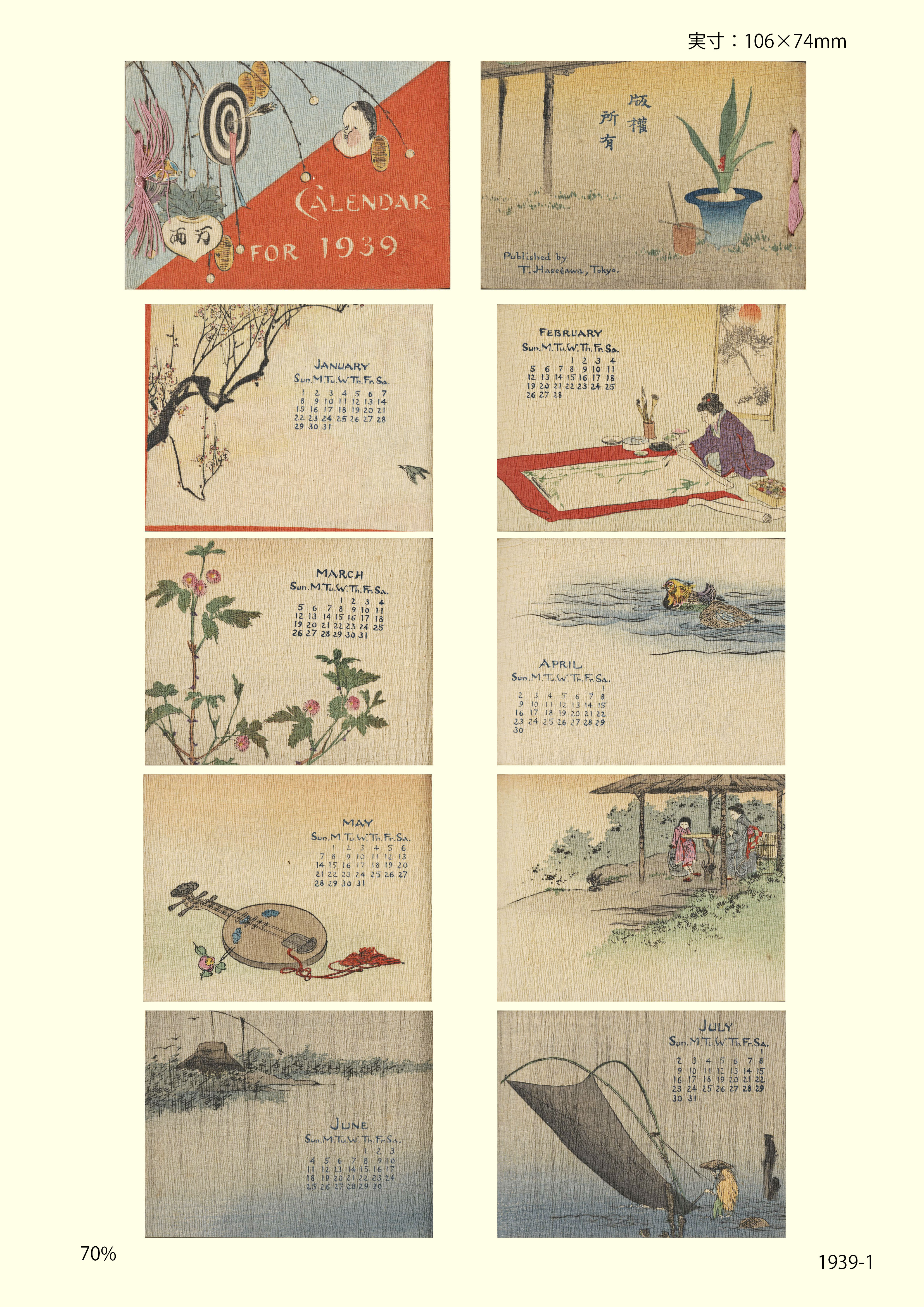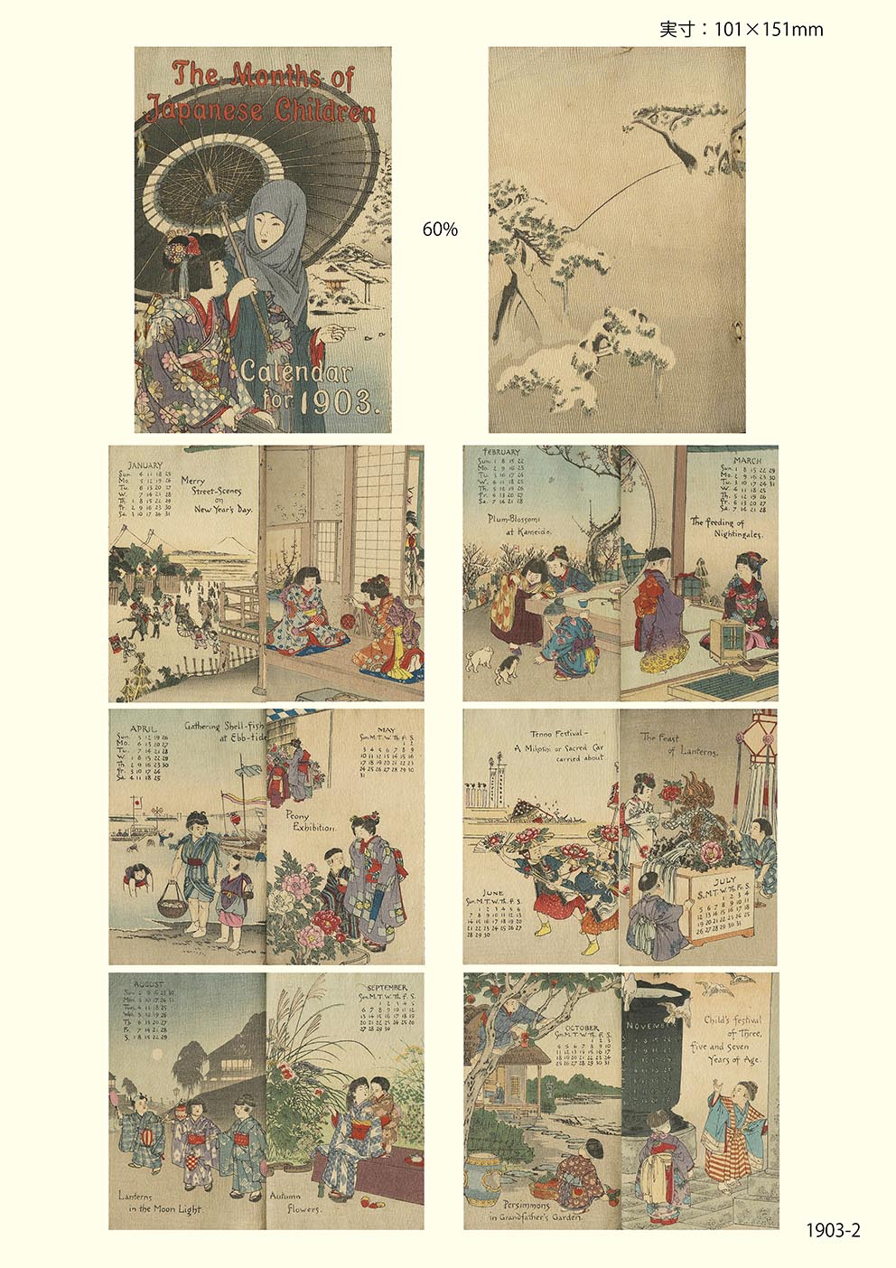 | 67 | 1908-2 | 明治41年 |  |  | Japanese Street Scenes Calendar for 1908 | | *Takejiro Hasegawa | | | | | | | | | | | 製本されておらずちりめん紙だがハードカバー、表紙なし