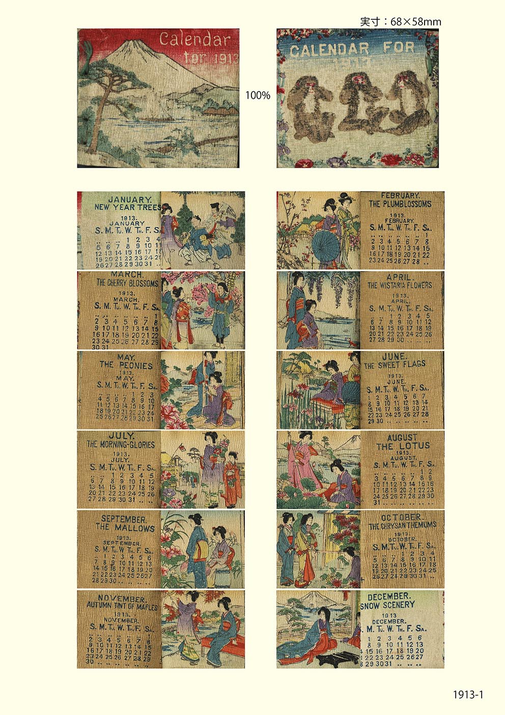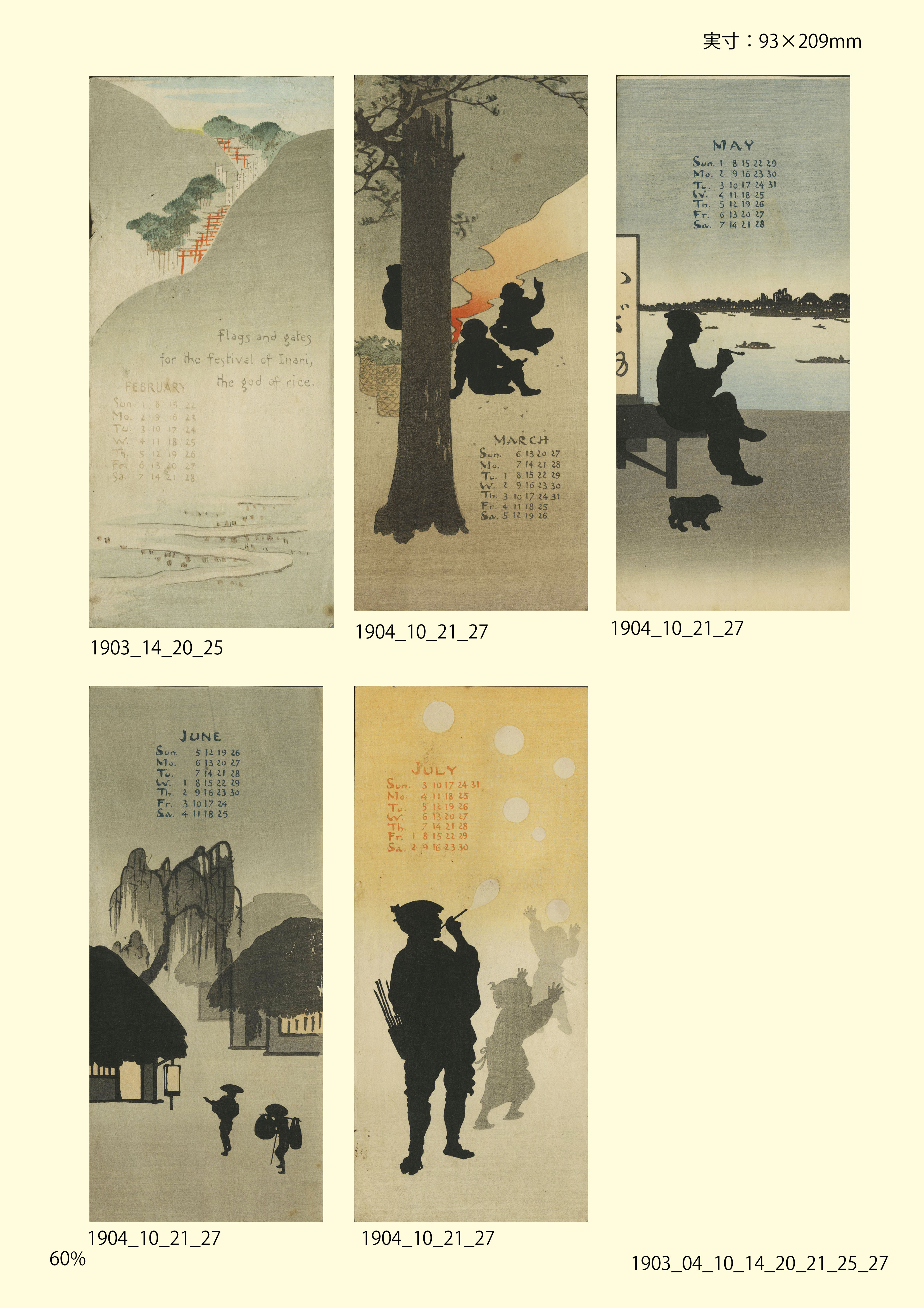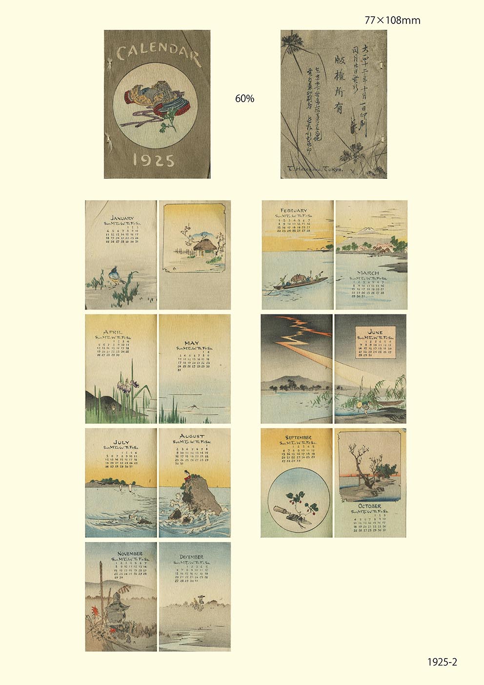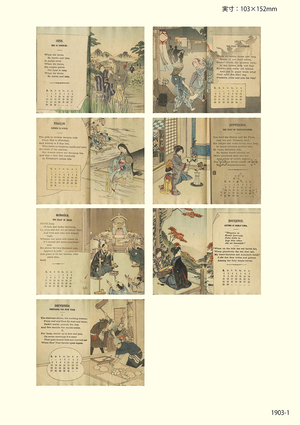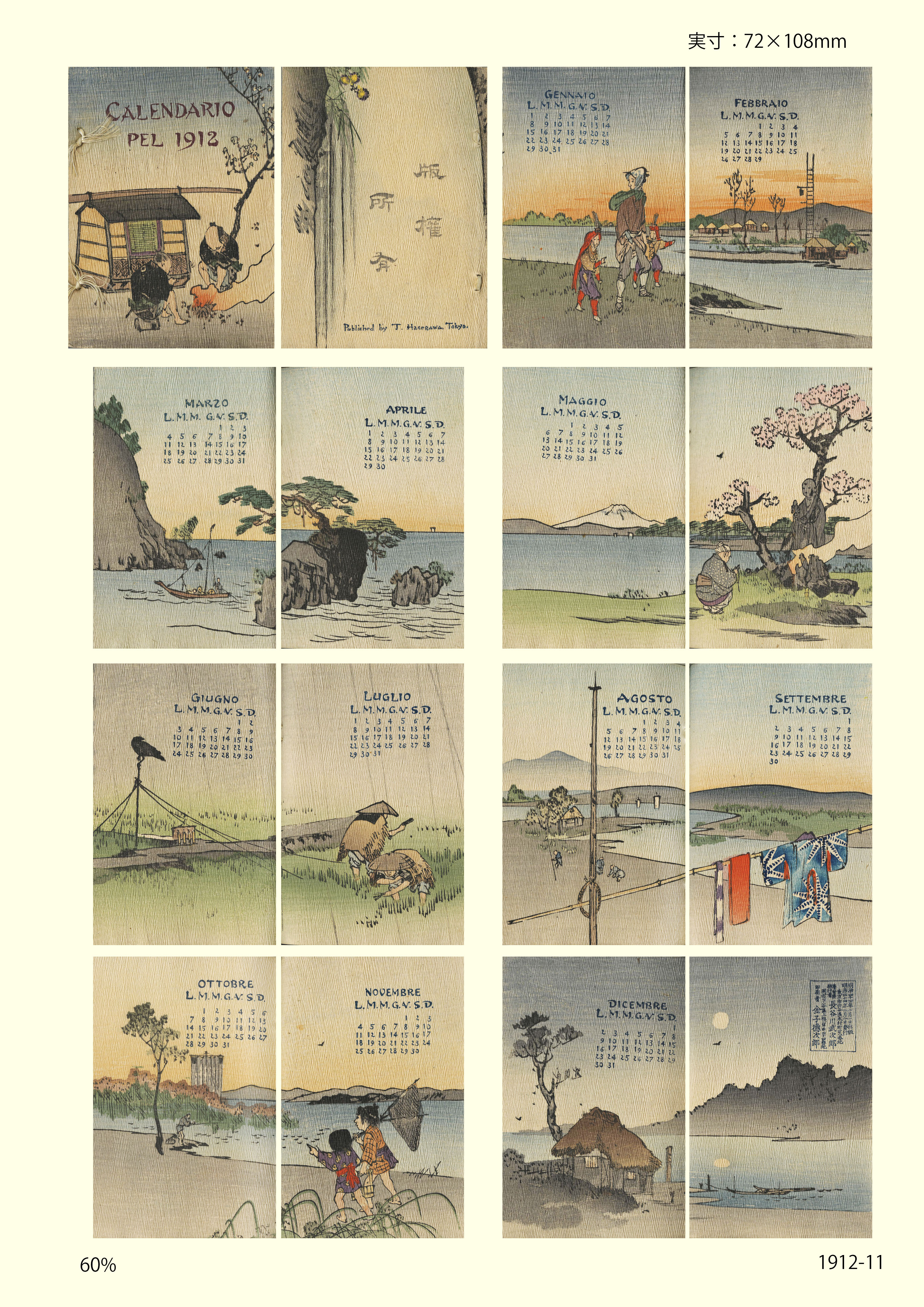 | 67 | 1908-2 | 明治41年 |  |  | Japanese Street Scenes Calendar for 1908 | | *Takejiro Hasegawa | | | | | | | | | | | 製本されておらずちりめん紙だがハードカバー、表紙なし