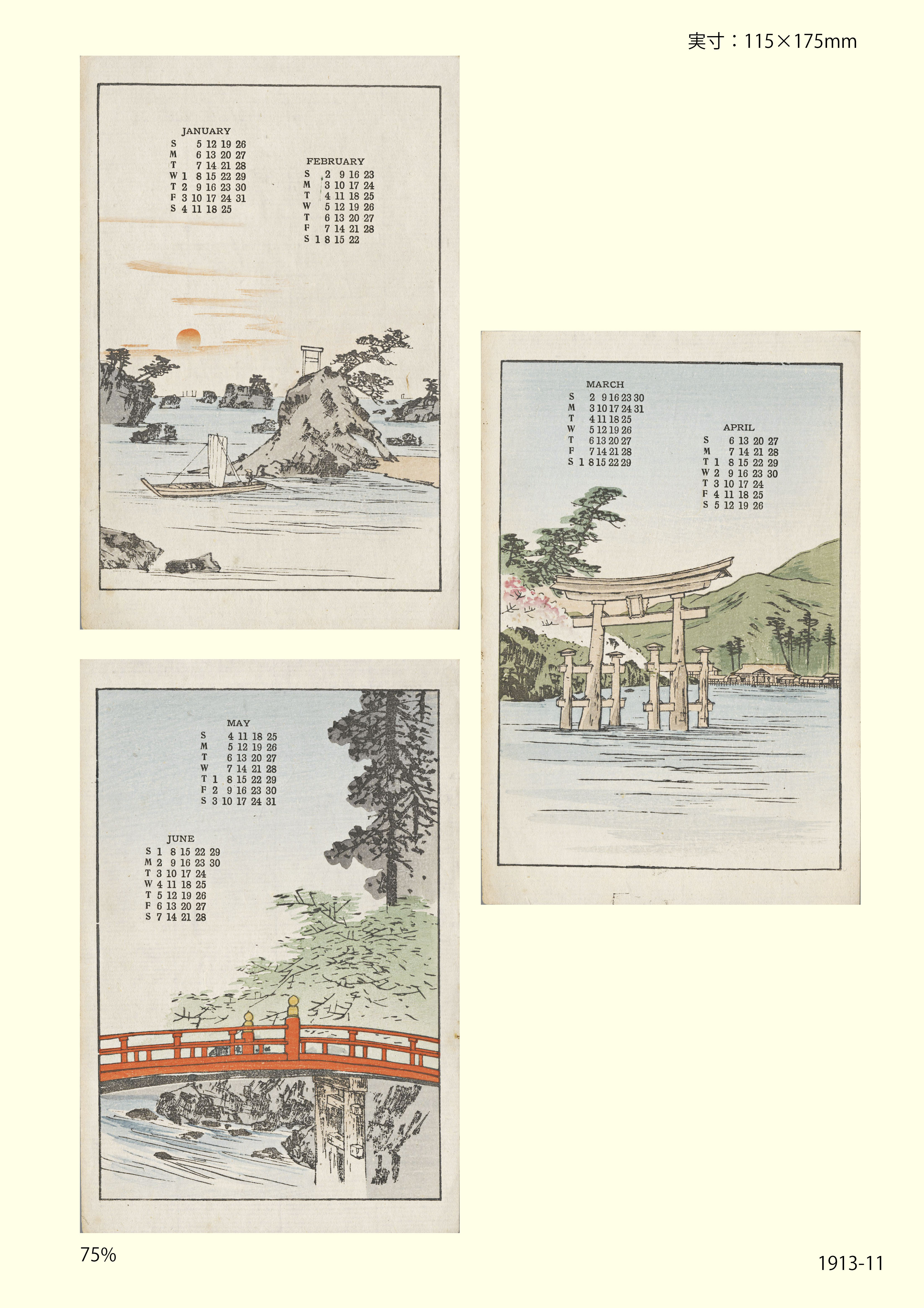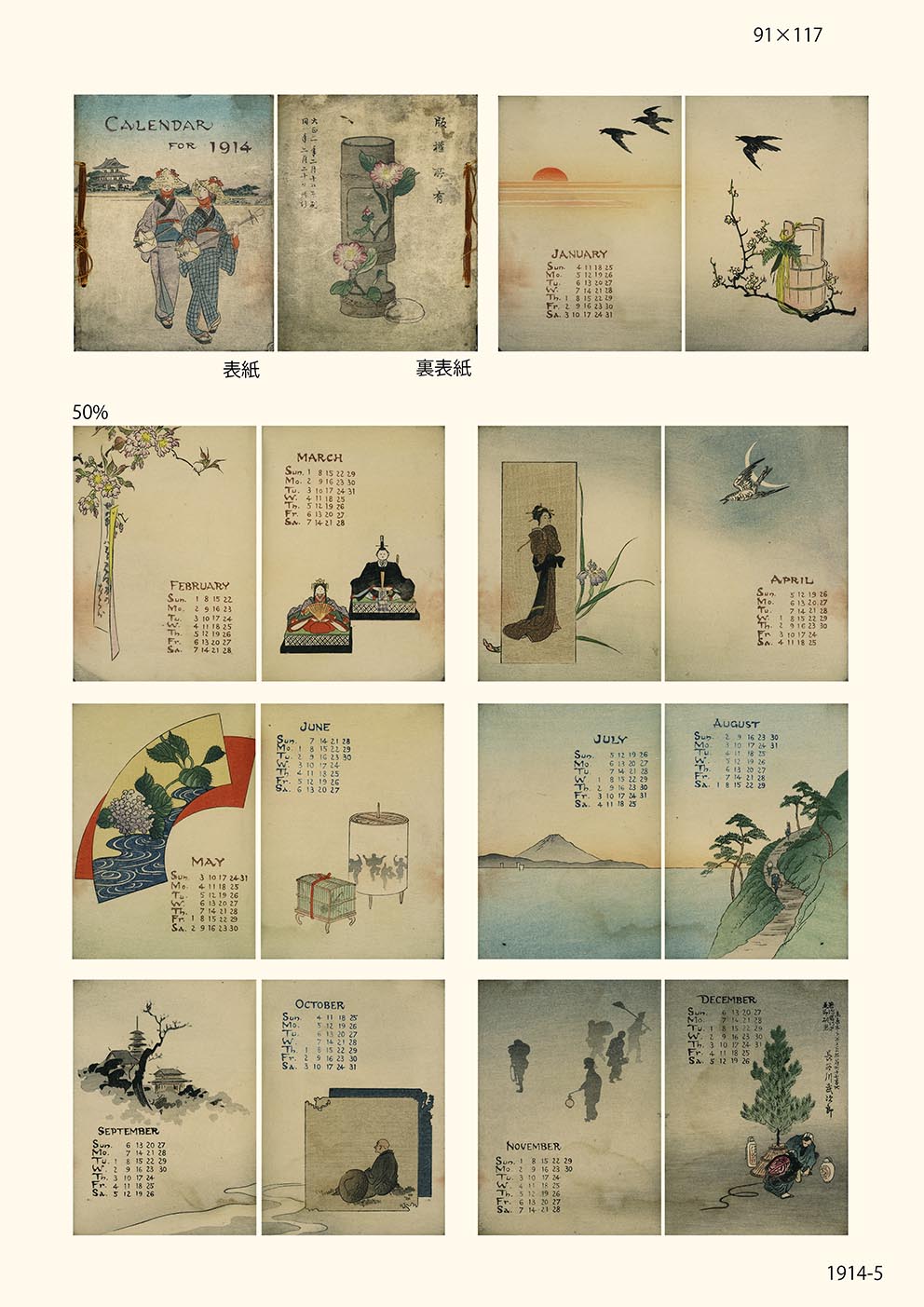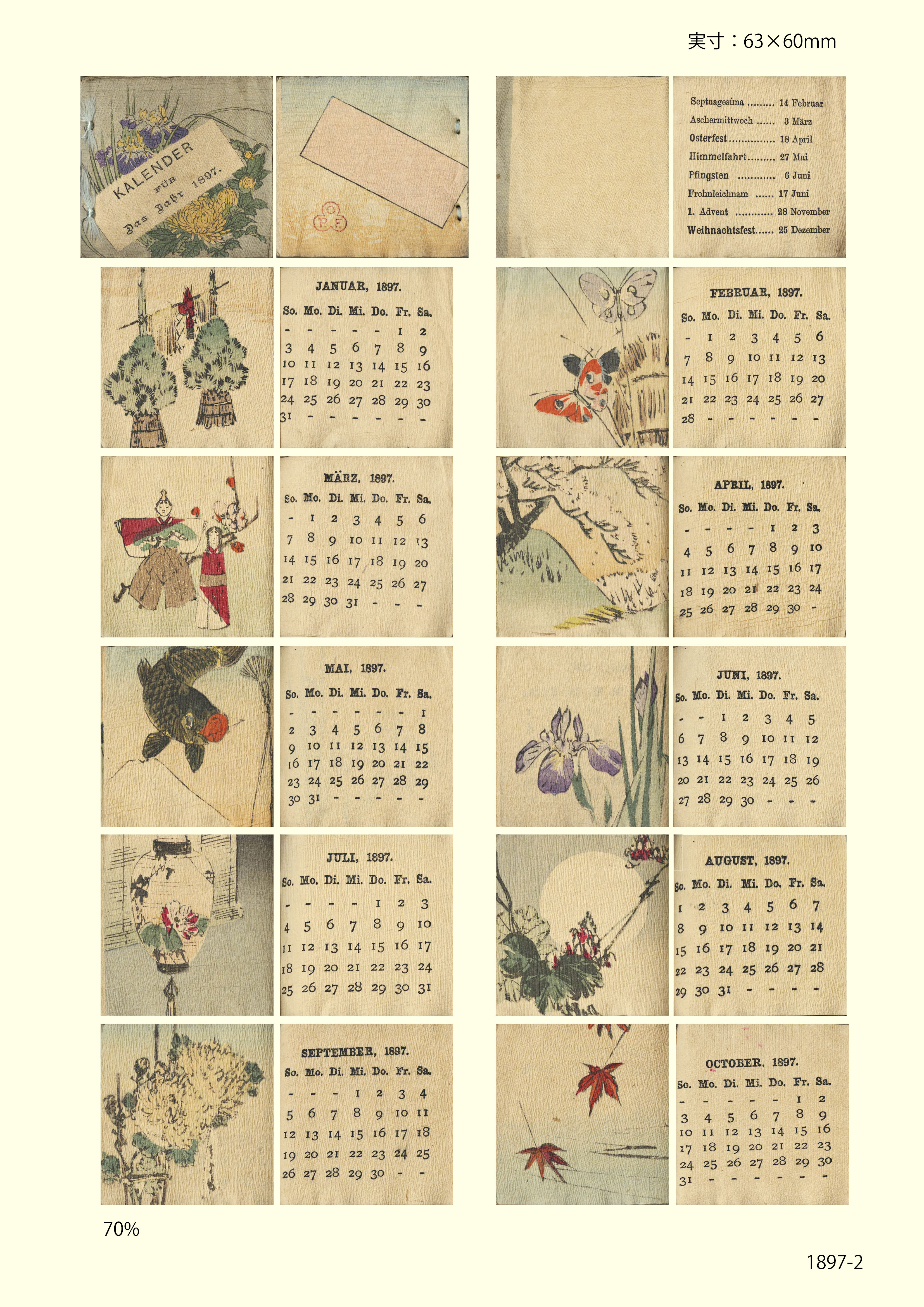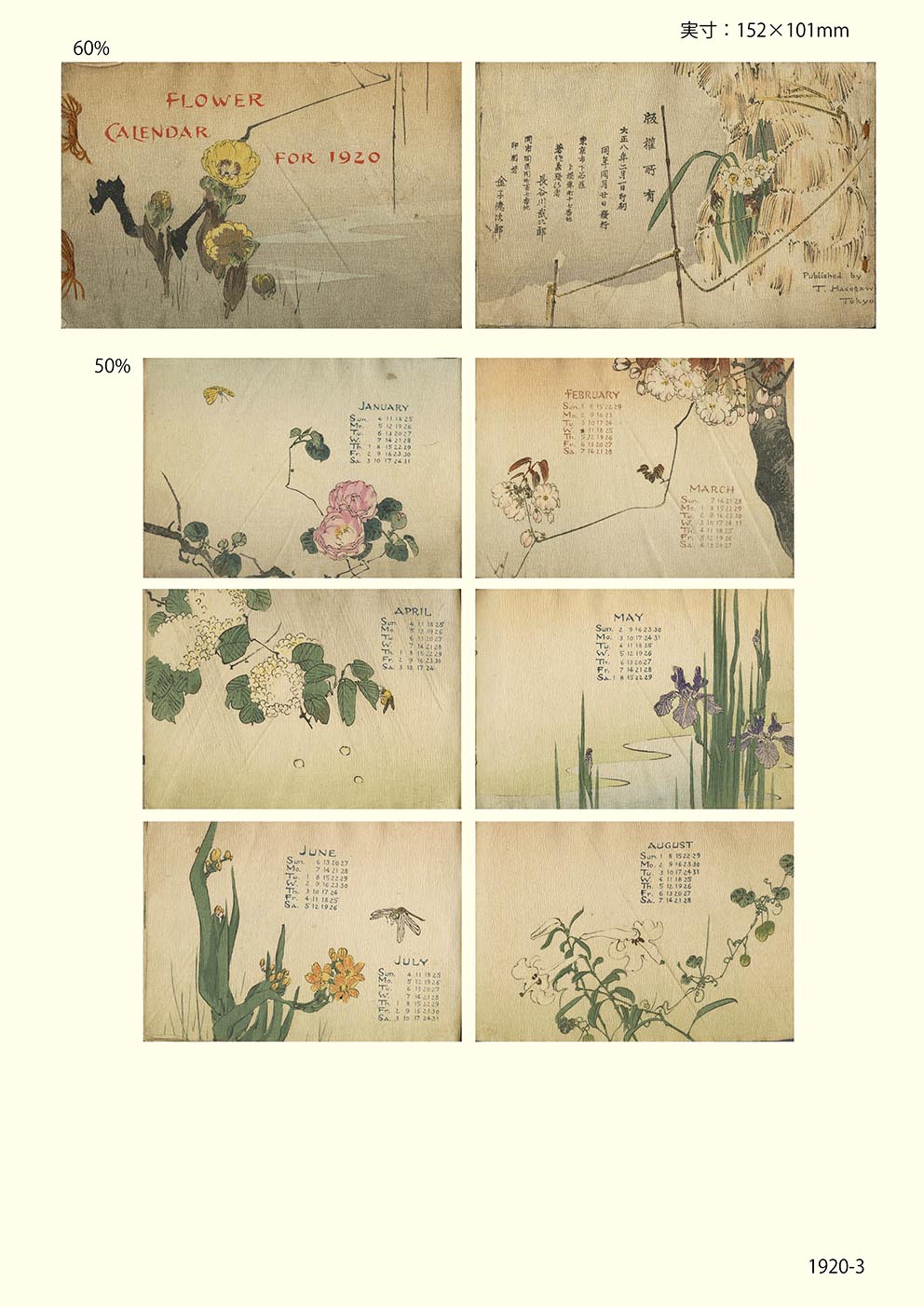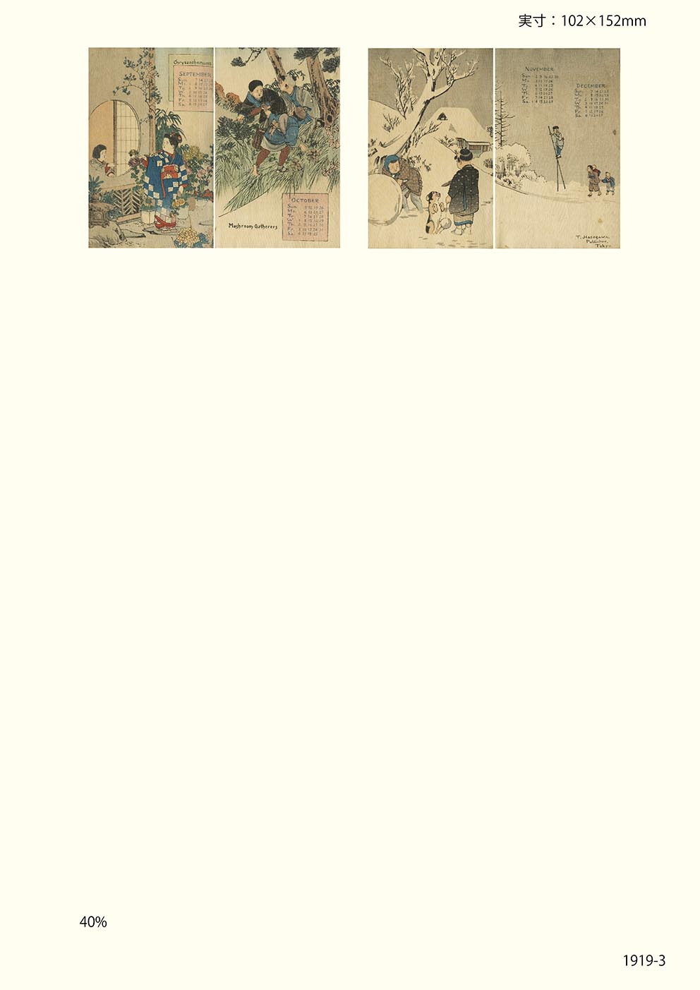 | 67 | 1908-2 | 明治41年 |  |  | Japanese Street Scenes Calendar for 1908 | | *Takejiro Hasegawa | | | | | | | | | | | 製本されておらずちりめん紙だがハードカバー、表紙なし
