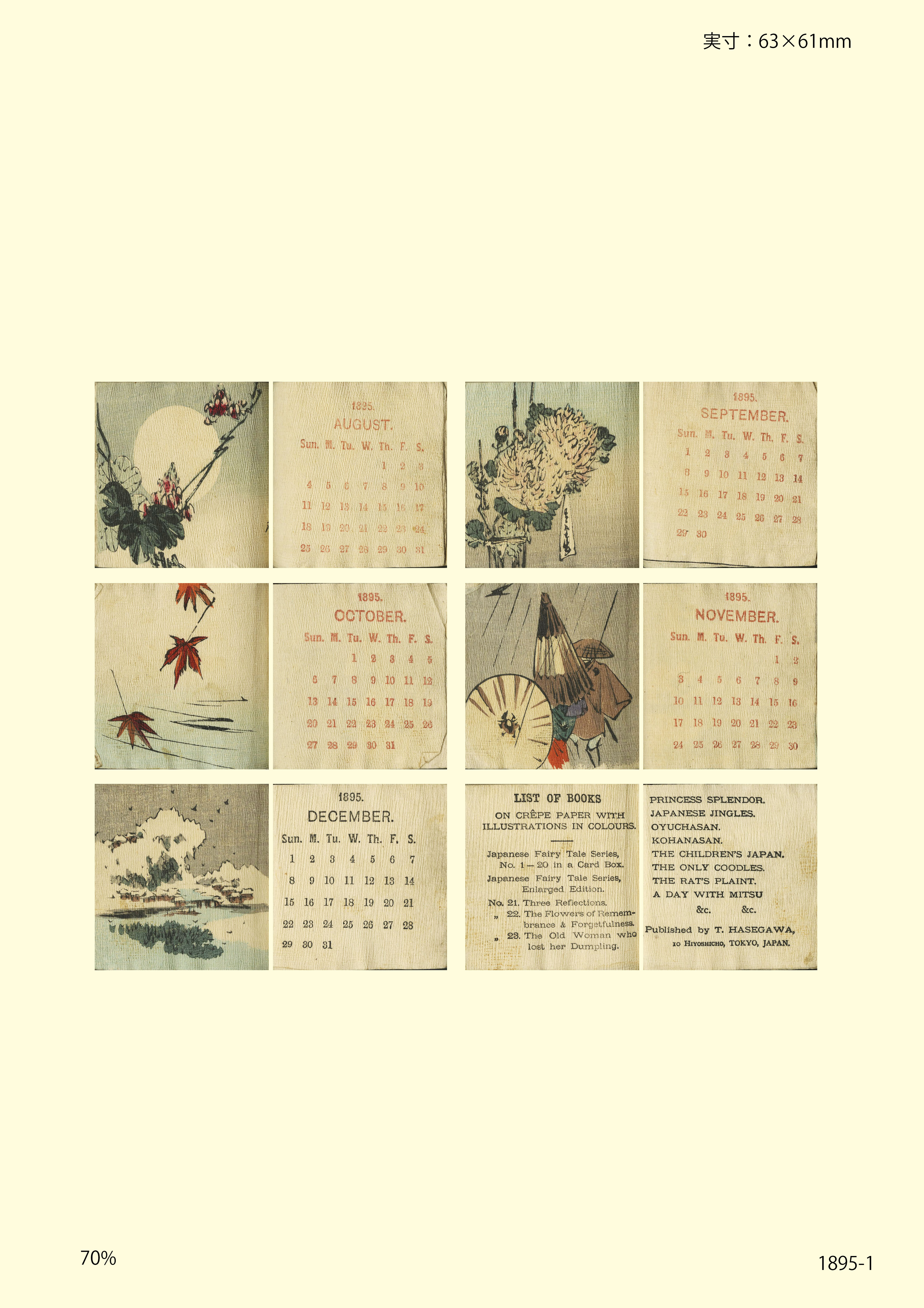 | 1 | 1895-1 | 明治28年 |  |  | CALENDAR 1895 | Takejiro Hasegawa | | 10 Hiyoshicho,Tokyo | | | | | | | | | | List of books(Fairy tale 20など)