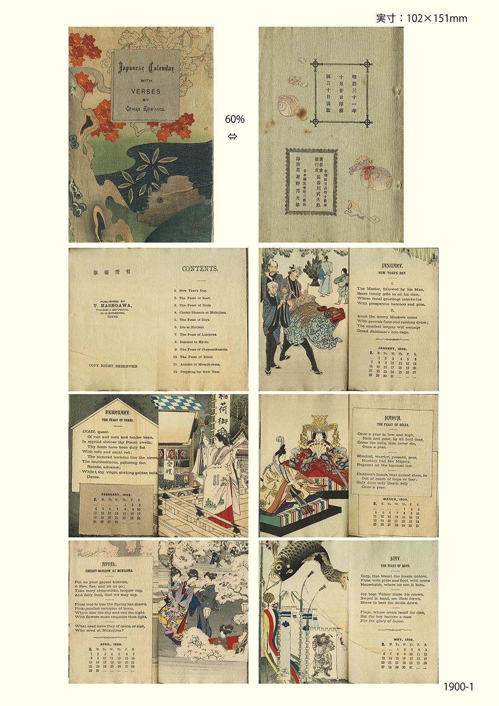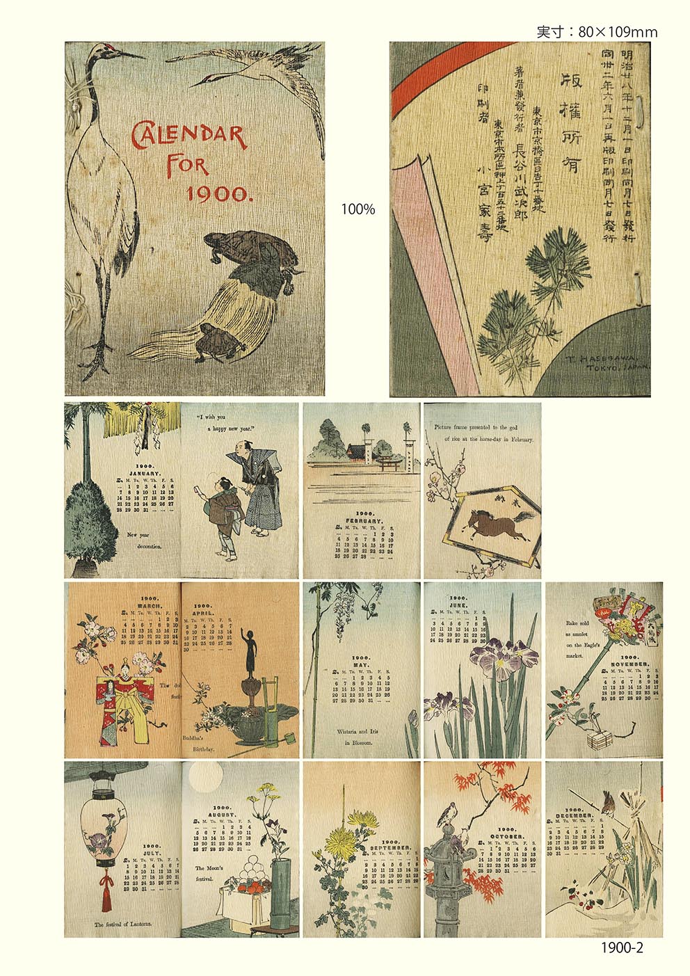 | 12 | 1900-3 | 明治33年 |  |  | CALENDAR FOR 1900 | | | | | T.HASEGAWA | 10 Hiyoshicyo,TOKYO | | | | | | | | 62 | 61 | 28 | 1 | 0 | 1 | 20200322 |