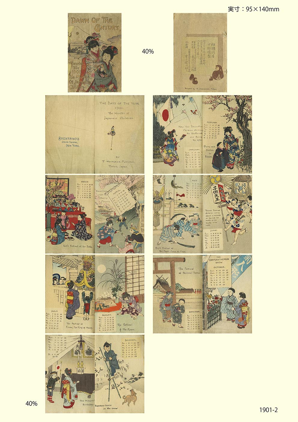 | 13 | 1901-1 | 明治34年 |  |  | DAWN OF THE CENTURY Calendar For 1901 The Months Of Japanese Children | 長谷川武次郎 | Takejiro Hasegawa | 東京市京橋区日吉町10 | 金子徳次郎 | Tokujiro Kaneko | 麻布区飯倉町5-36 | - | 明治30年9月7日 | 1897/9/7 | | 明治33年2月1日 | 明治33年2月7日 | 2月1日添題再版 | 96 | 140 | 16 | 1 | 0 | 1 | 20200512 |