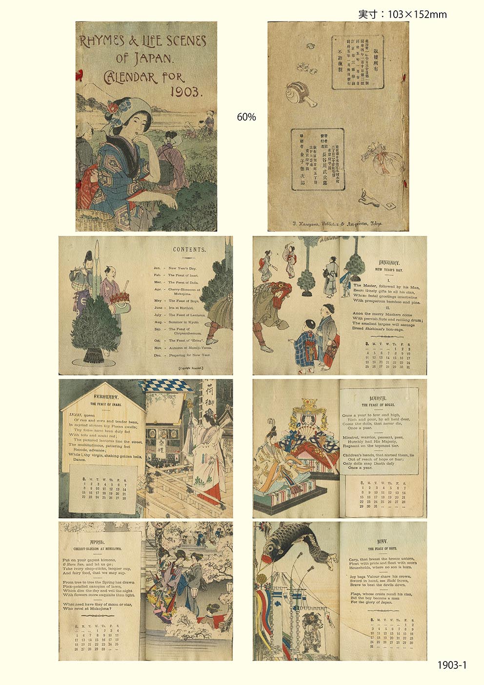 | 25 | 1903-1 | 明治36年 |  |  | RHYMES&LIFE SCENES of JAPAN CALENDAR for 1903 | 長谷川武次郎 | Takejiro Hasegawa | 東京市日本橋区本材木町2-20 | 金子徳次郎 | Tokujiro Kaneko | 麻布区飯倉町5-36 | - | 明治31年10月30日 | 1898/10/30 | | 明治35年1月20日 | 明治35年1月30日 | 1月20日訂正三版印刷 | 103 | 152 | 28 | 1 | 0 | 1 | 20191026 |