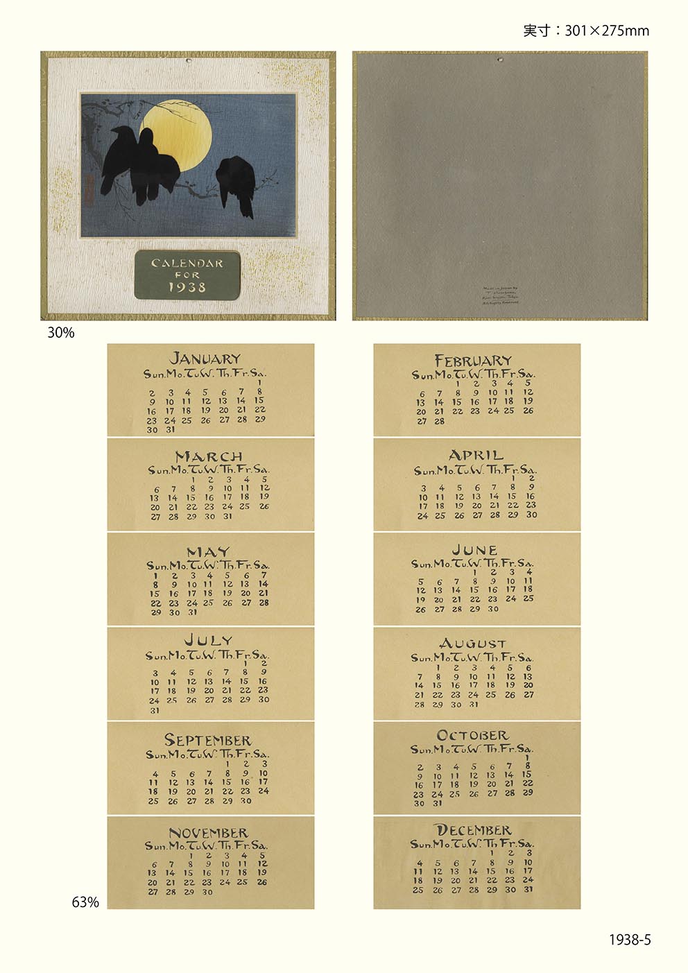 | 257 | 1938-5 | 昭和13年 |  |  | CALENDAR FOR 1938 | | T.Hasegawa, Kami Negishi, Tokyo | | | | | | | | | | | 壁掛カレンダー、月めくりは平紙、カラスは布張り | 301 | 275 | 14 | 1 | 0 | 1 | 20200627 |